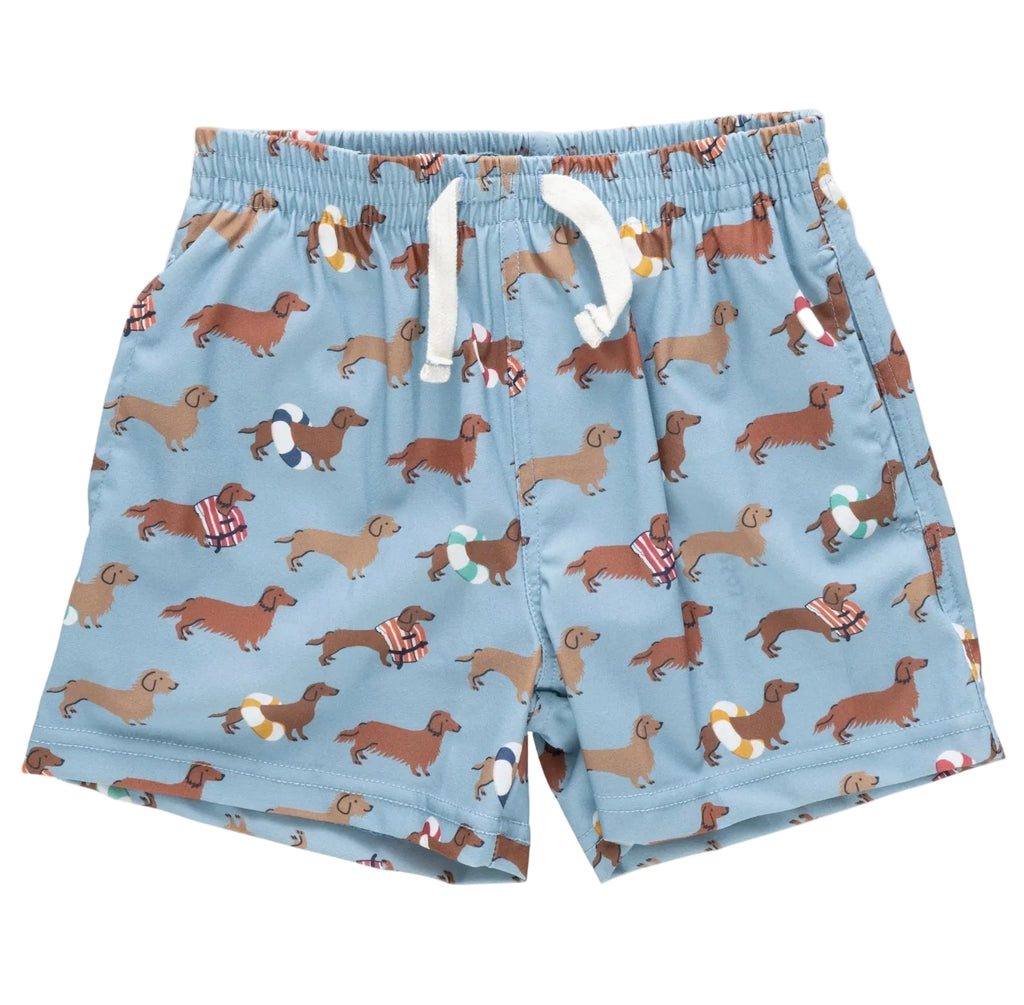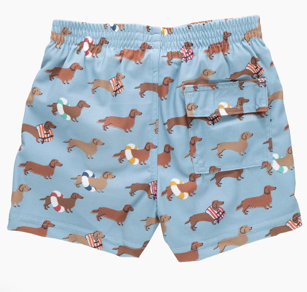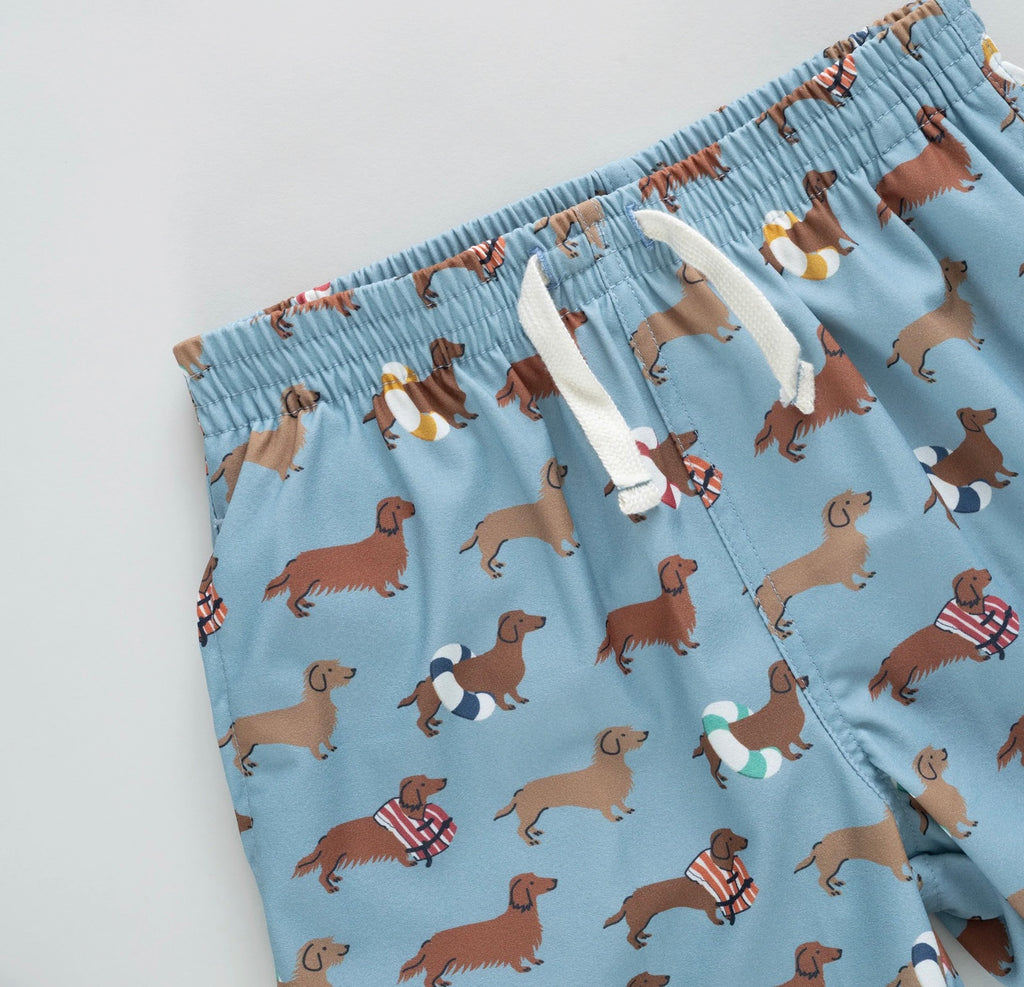 Signature dachshunds make a splash in this charming and spirited print. Designed with side pockets, a right back pocket, and an easy elastic waistband, this trunk combines comfort with personality. A guaranteed favorite for dog lovers and summer adventurers alike!
