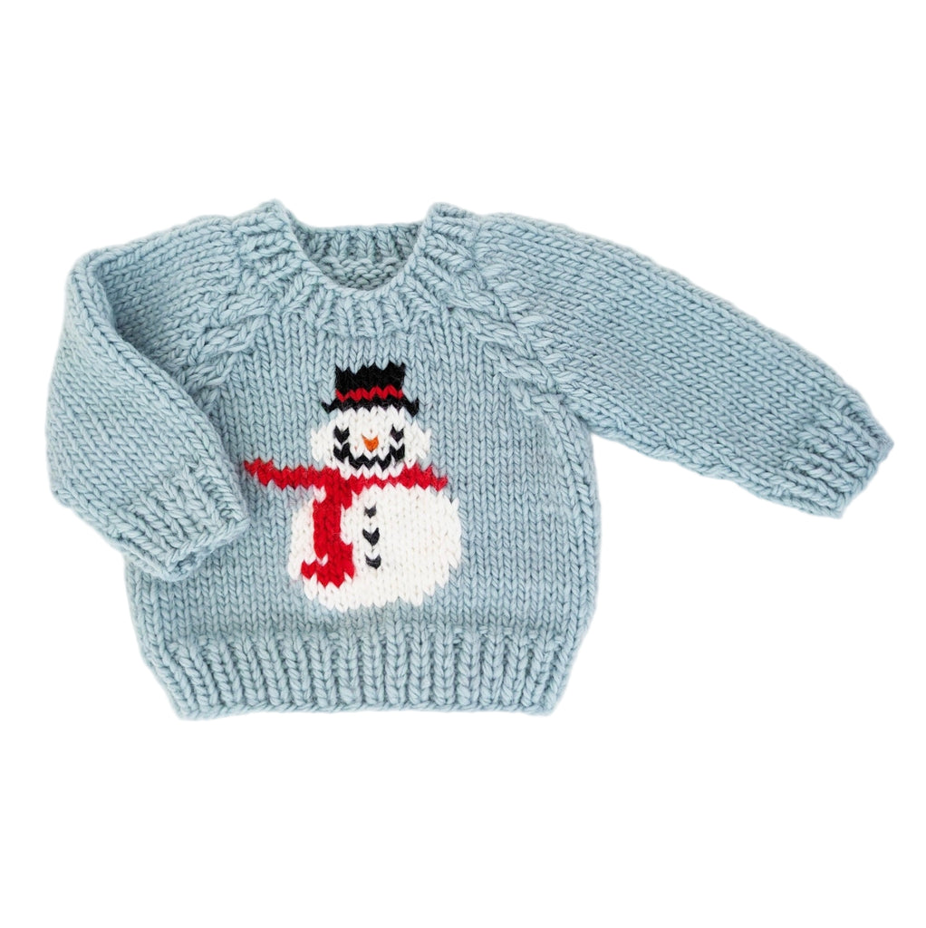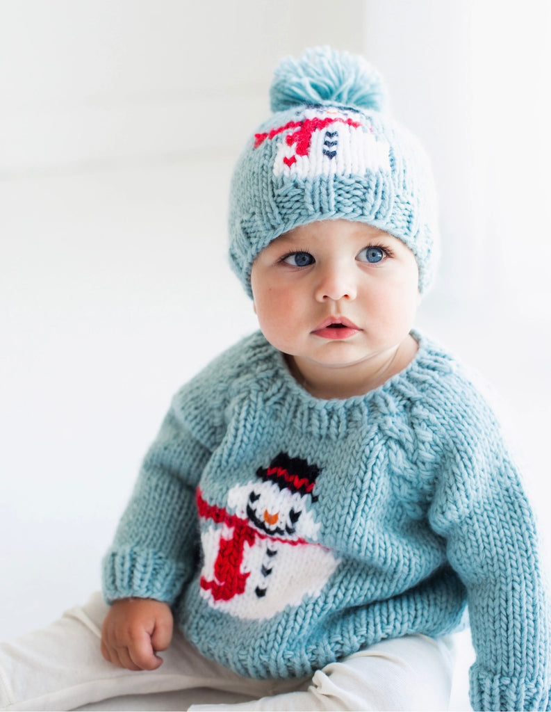 This charming hand-knit sweater features an adorable Frosty the snowman design on the front, perfect for the winter season. The soft neckline ensures easy dressing for your little one, making it a practical choice for busy mornings!