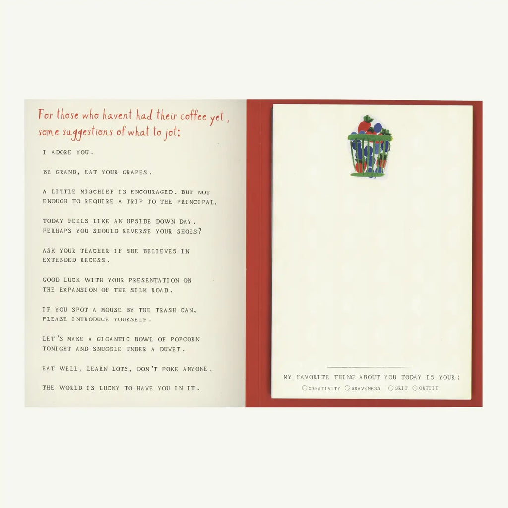 A cheerful way to remind your little ones that you're thinking of them (and that you put serious effort into packing those carrot sticks). Each pad features charming snack icons and handy prompts—perfect for those pre-coffee mornings when words are hard.