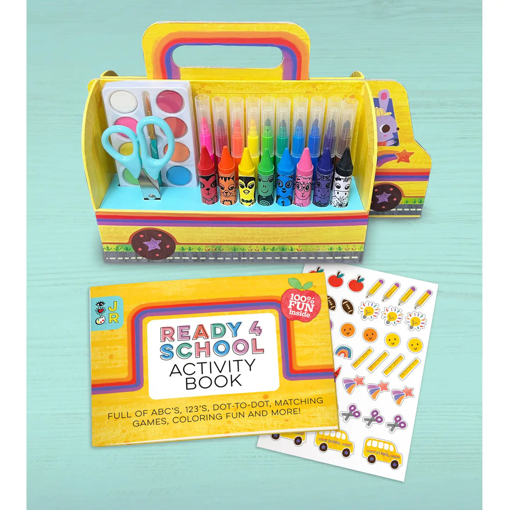 All-in-one school art supply set housed in a charming bus-shaped desk caddy. This new classic will quicly become their favorite take-along activity! Includes 8 fun character crayons and 10 vibrant markers, watercolors, brush and scissors for endless creative possibilities. The included activity book is filled with ABC's, 123's, dot-to-dot, matching games, and coloring fun. Comes with stickers to add extra flair to your drawings!