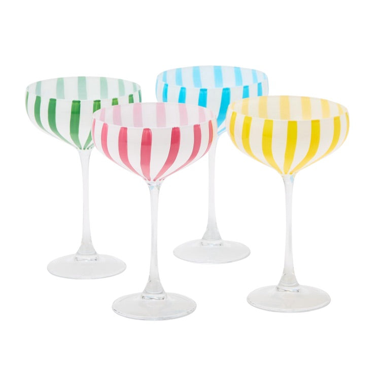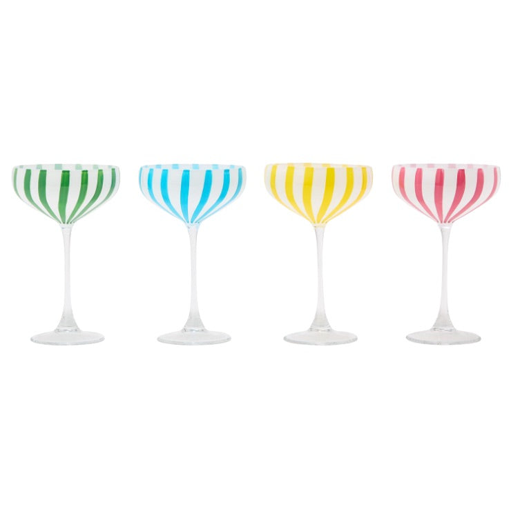 Celebrate your tablescape with the Hand-Painted Stripe Coupe Glasses. Crafted with care, each glass features unique stripes in Blue, Pink, Green, and Yellow, adding a pop of color to your decor. With a 12 oz capacity, these glasses are perfect for serving your favorite cocktails or mocktails.