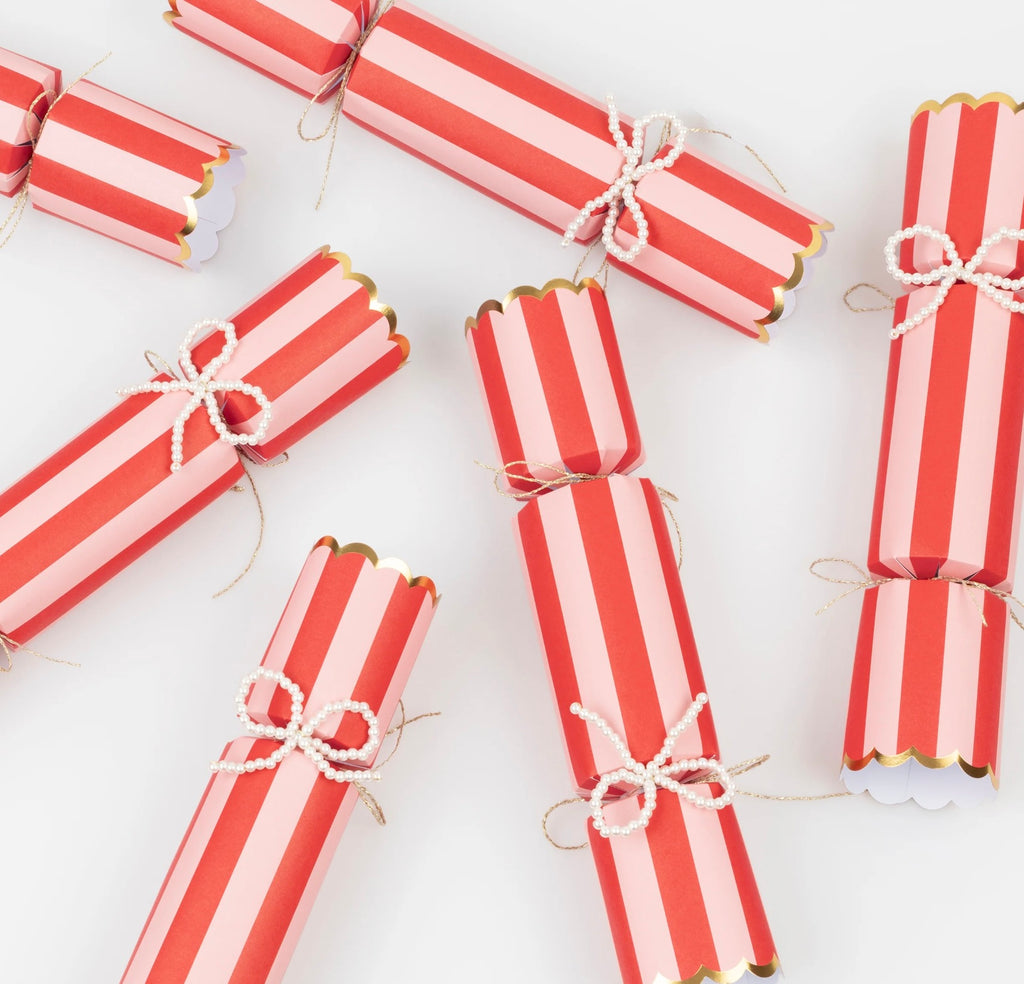 No Christmas table is complete without the fun and excitement of Christmas crackers! These festive delights combine a bold striped design with elegant faux pearl beaded bows, adding a pop of color and sophisticated style to your party table. Plus, you can remove the bows and use them as chic Christmas tree decorations. Inside each of these luxury crackers is a joke, a paper crown and a premium gift, to get everyone in the holiday spirit.