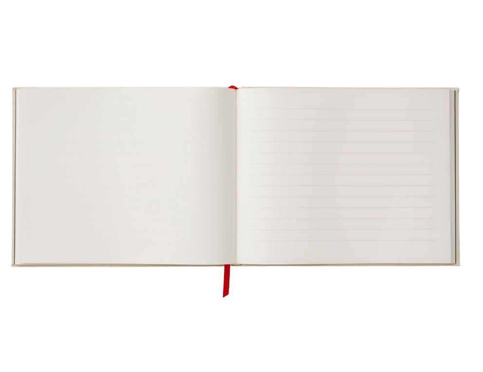 The embroidered guest book is a large hardcover journal with 144 interior pages half lined and half blank so guests can write a note, add in a sketch, or paste in a photo to create a one-of-a-kind keepsake. The cover is wrapped in book cloth and embroidered with the beautiful Christmastide Pomegranate design, finished with a grosgrain ribbon bookmark to save your place.
