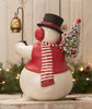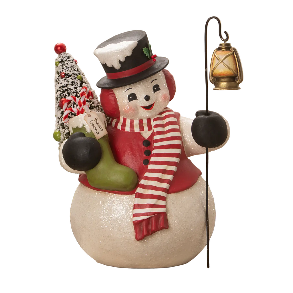 Snowman Stanley is sharing Christmas cheer everywhere he goes this holiday season. This paper mache jolly snowman is wearing a festive black top hat adorned with snow and lacquer holly and berries, red vest and a red and white stripped scarf. He holds a green stocking with chenille candy canes and a white bottle brush tree. The white bottle brush tree is decorated with red and green beads covered with glitter. He also hold a lantern that hangs form a staff. Snowman Stanley will bring you holiday cheer for many years to come.