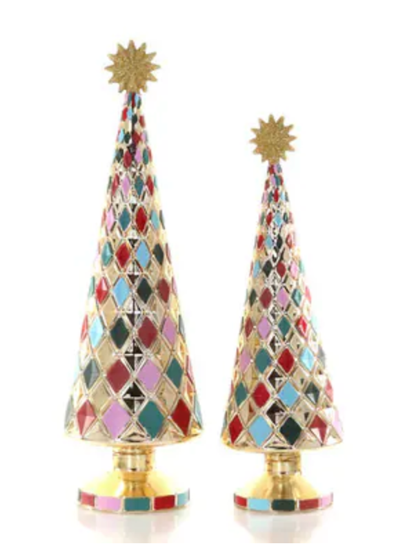 e the charm of mid-century modern design with the Stacked Multi Diamond Tree – Large by Cody Foster. This handcrafted glass ornament features a tiered, cone-shaped silhouette adorned with alternating rows of colorful diamond patterns, capturing the essence of retro holiday aesthetics.