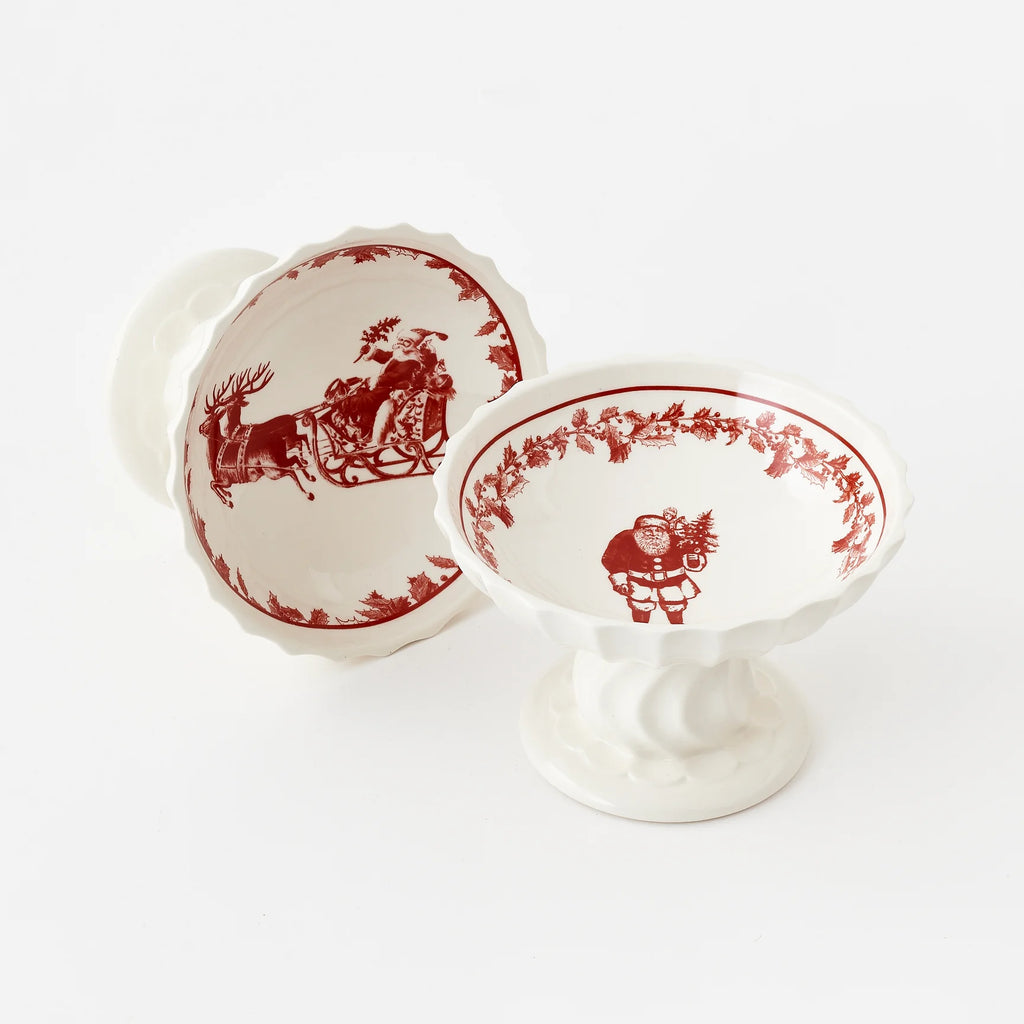 Serve or display in festive style with these Yuletide compotes. Available in two assorted holiday designs, each pedestal dish features classic seasonal patterns and elegant detailing, perfect for holding candies, nuts, or decorative accents. A charming addition to your holiday table or décor, these versatile pieces bring timeless cheer to any celebration.