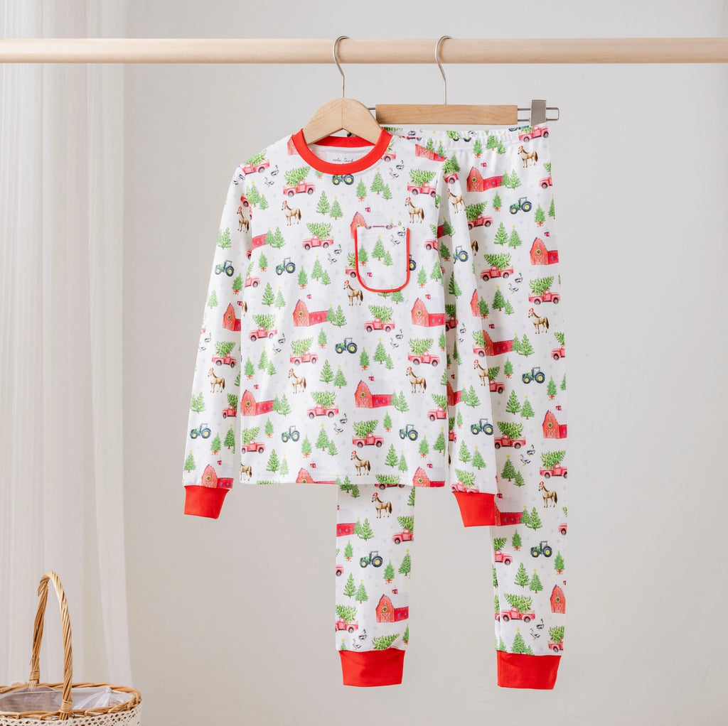 Bring the charm of a snowy pine forest to bedtime with these pajamas! Featuring a festive, rustic all-over Christmas tree farm print, these cozy, breathable pajamas are perfect for little ones ready to drift off among twinkling evergreens.