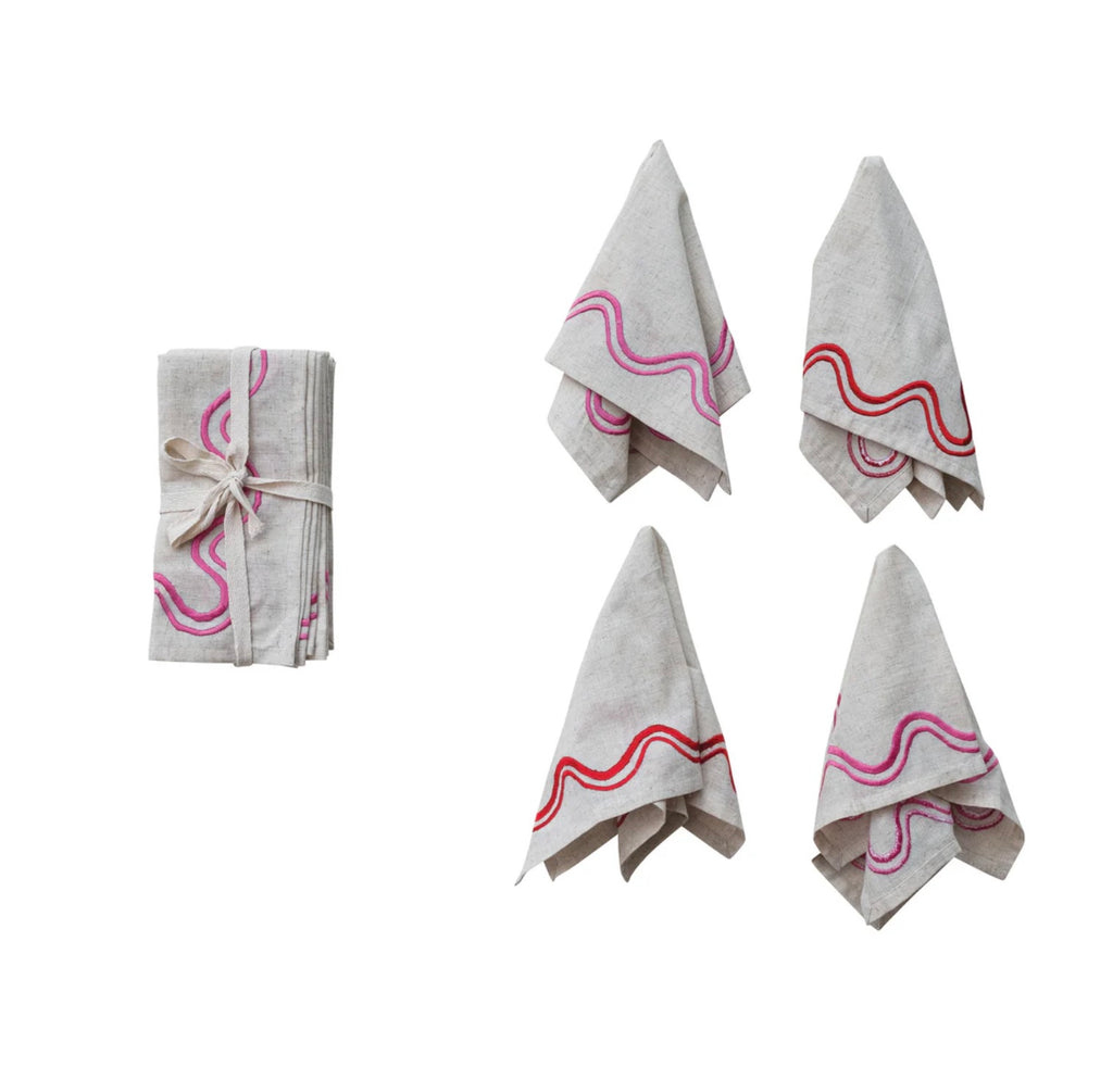 Elevate your table with this exquisite set of four 18-inch square napkins, made from a luxurious cotton and linen blend. The set includes two vibrant red and two striking hot pink napkins, each adorned with finely embroidered wavy lines and finished with a coordinating hot pink trim. Elegantly tied with tape, these napkins offer a sophisticated pop of color and texture to elevate any dining occasion!
