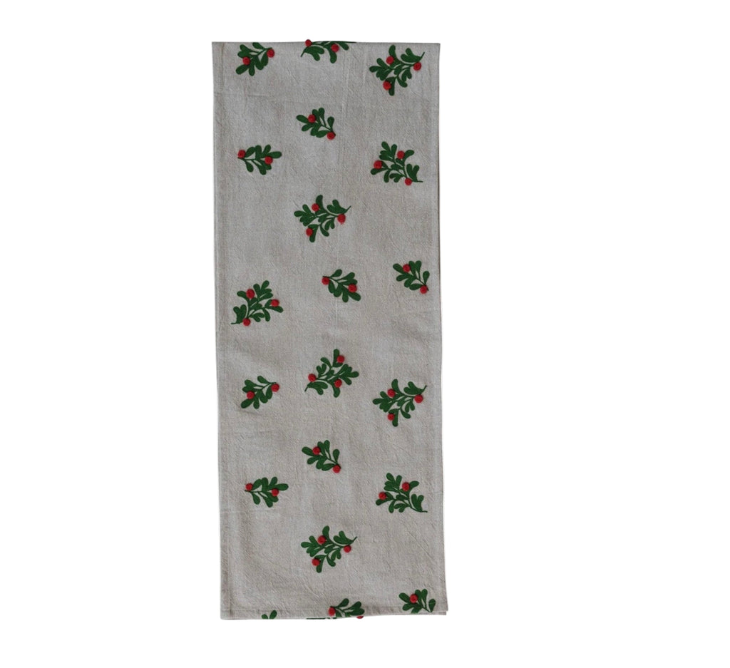 Add a touch of seasonal elegance to any table setting with this Cotton and Linen Table Runner, featuring beautifully embroidered mistletoe patterns and playful pom poms. Embracing natural, green, and red tones, this runner is perfect for infusing winter and Christmas charm into dining décor.
