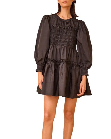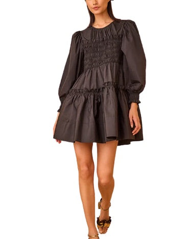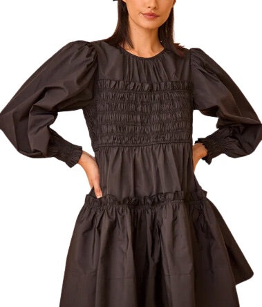 The Arley Dress is a captivating trapeze-style mini dress that beautifully combines comfort and elegance, featuring a fitted smocked panel at the chest. The full ruffle-edge skirt, adorned with exquisite purl stitching, adds intricate detail, while long sleeves with elastic openings ensure effortless wearability. Crafted from luxurious taffeta, this stunning piece is the perfect statement for embracing the festive season!
