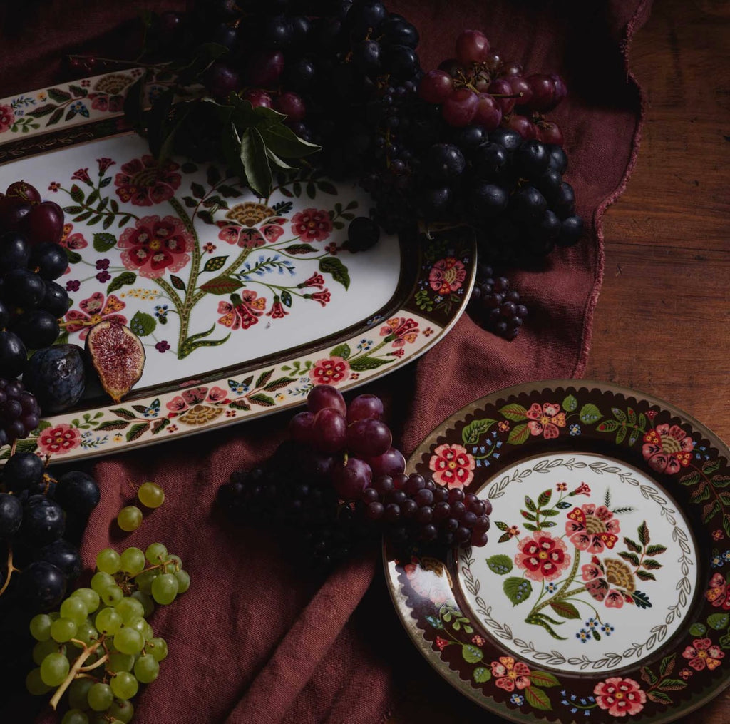 Serve hors d'oeuvres or family-style dishes on this elegant porcelain tray, featuring Gracie’s intricate, Jacobean-inspired florals, metallic gold accents, and a gold-painted edge.