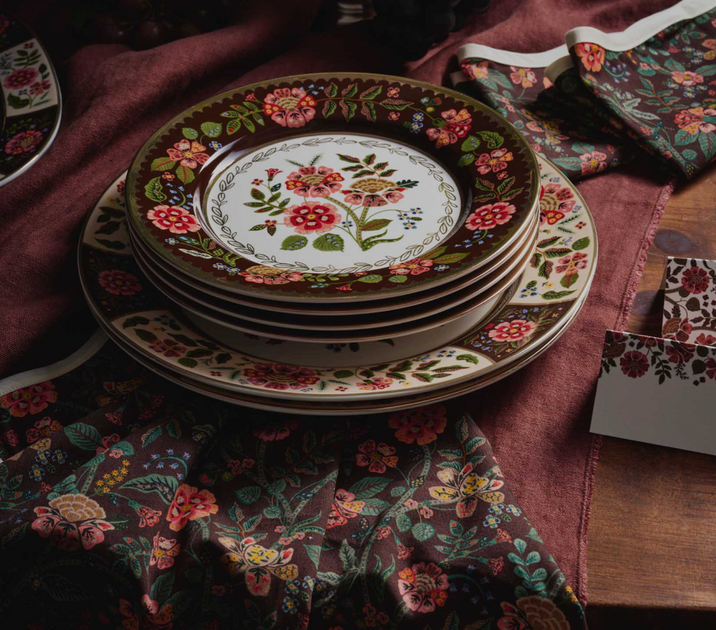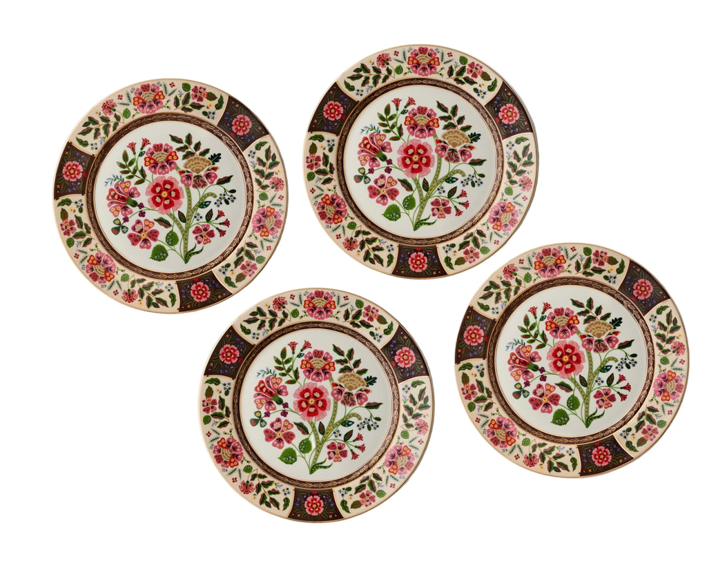 Elevate your table with these elegant Gracie-patterned dinner plates, featuring intricate, Jacobean-inspired florals, shimmering gold accents, and gold-painted edges.