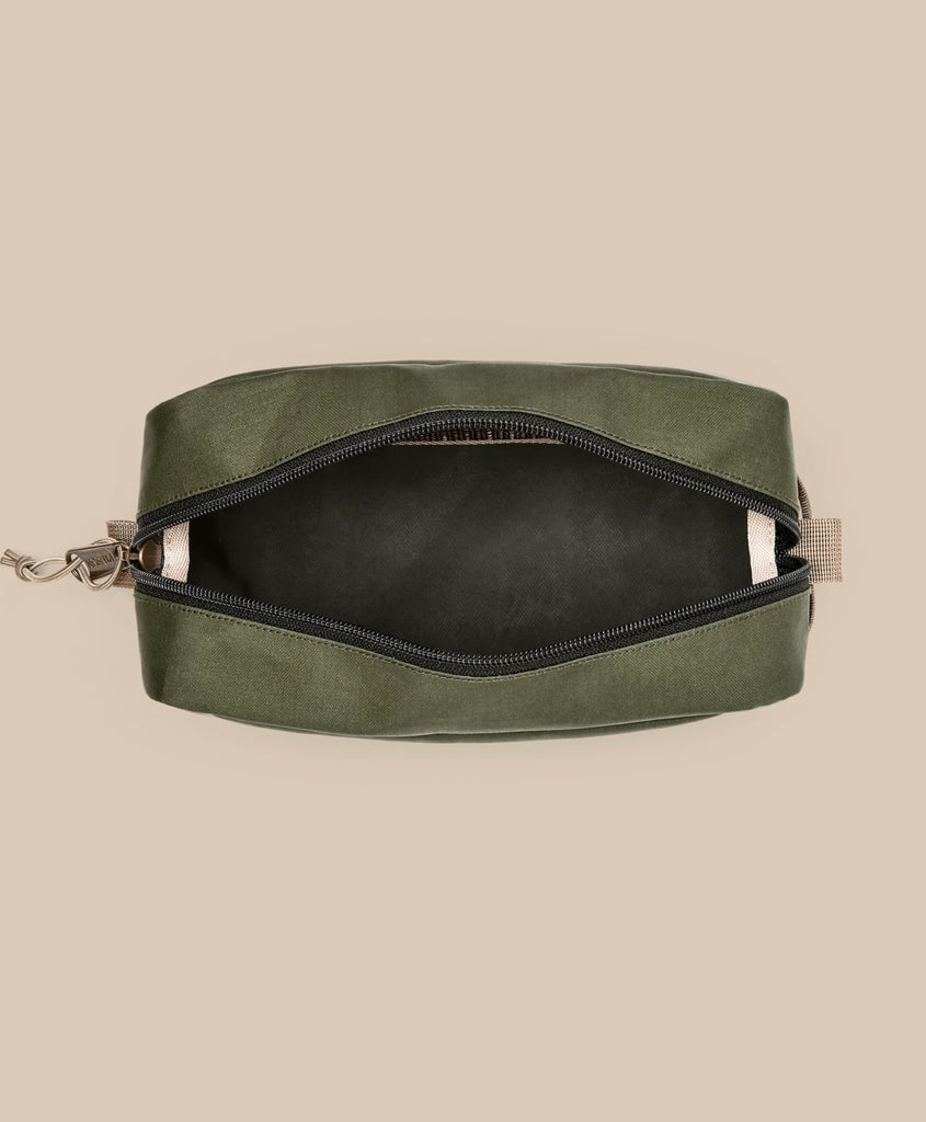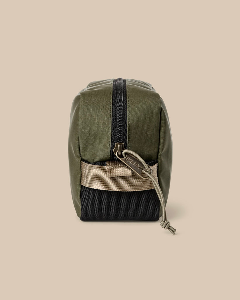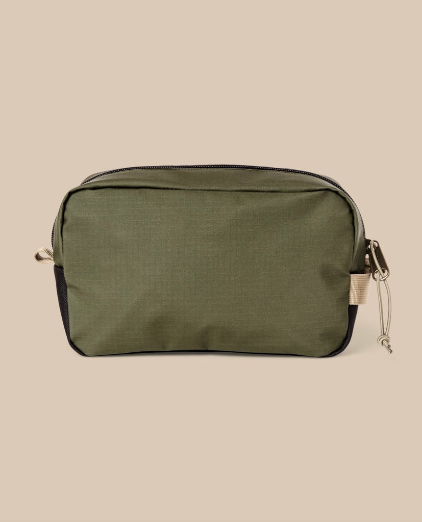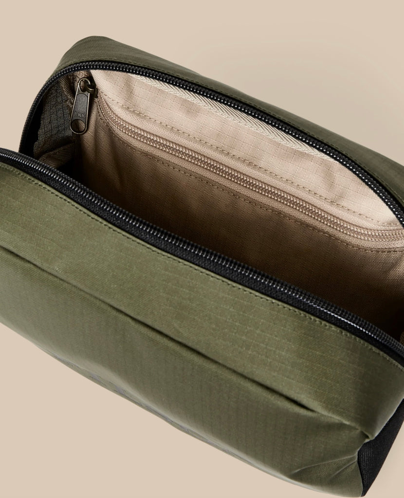 This Dopp kit is built from 300D recycled polyester that's coated with TPU for exceptional water resistance. It sheds rain, spills, and splashes with ease. The base is reinforced with heavier 600D recycled polyester, also TPU-coated, for added structure and long-term durability. Inside, two organizing pockets keep small items in place. One is mesh for quick visibility, and one secures with a zipper. The interior is fully lined to help contain leaks and make cleanup easy.