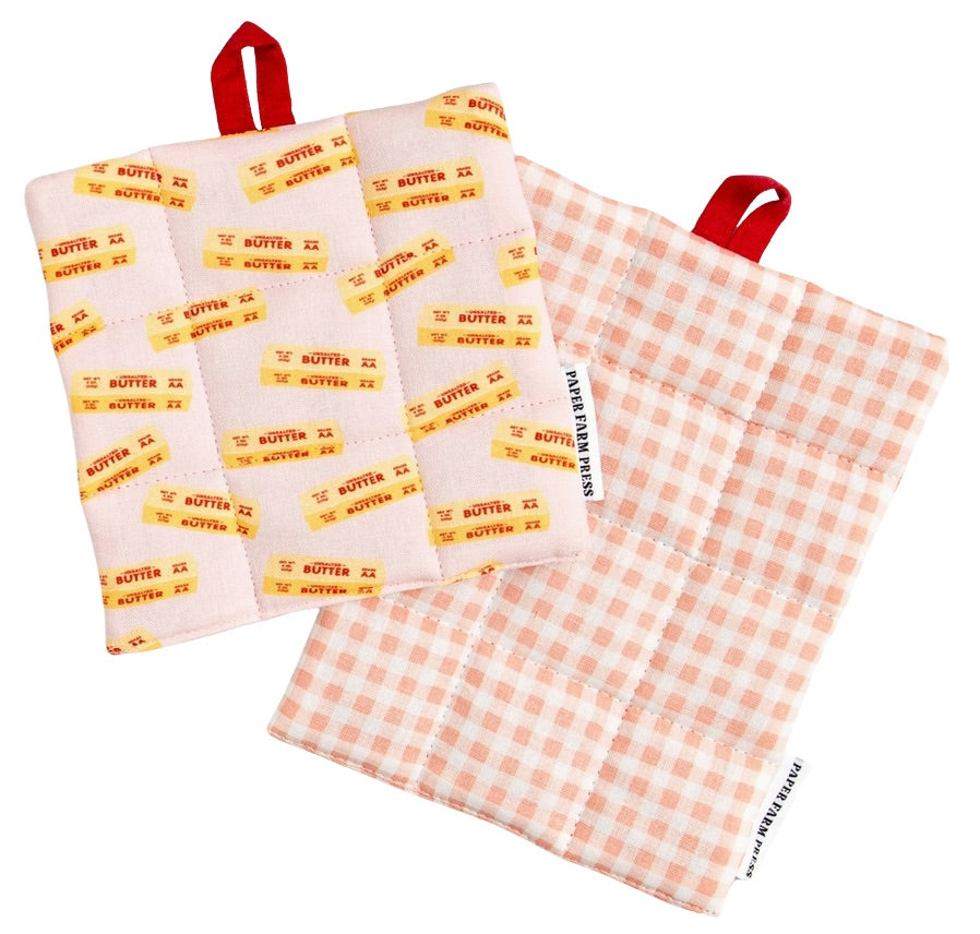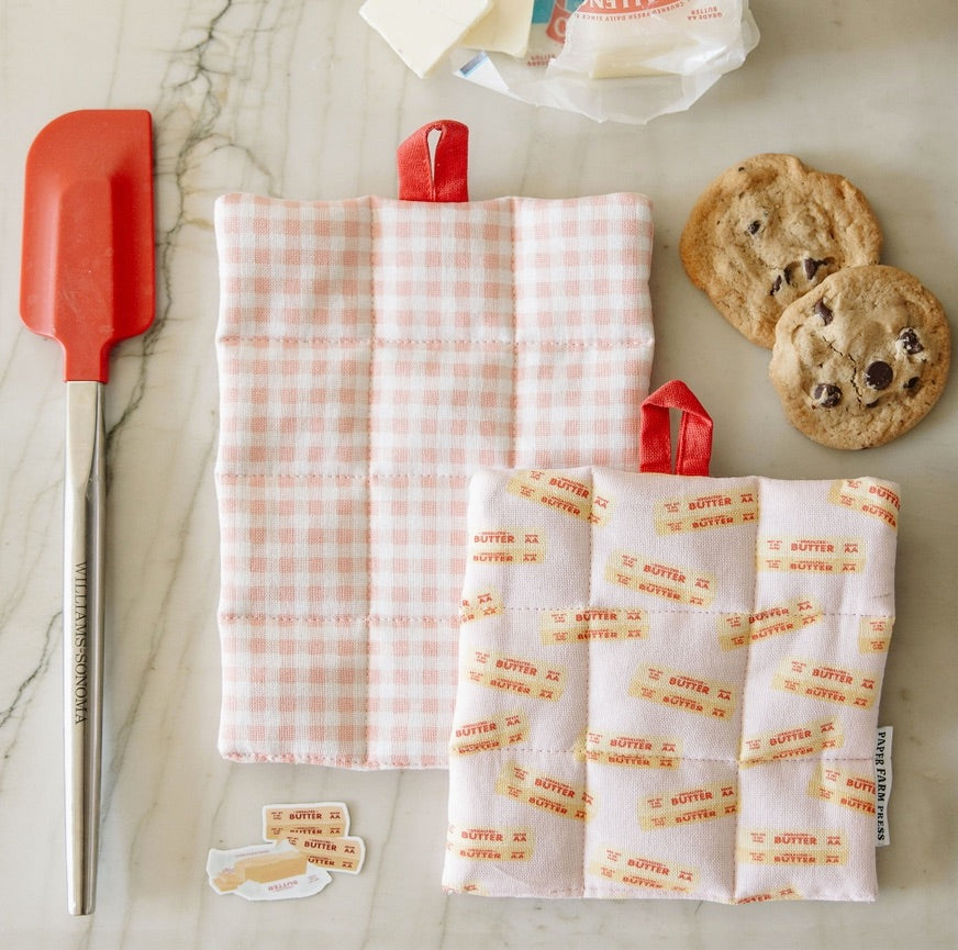 The set includes a matching blush gingham pot holder that beautifully complements the butter-themed design, making it a stylish addition to your kitchen essentials