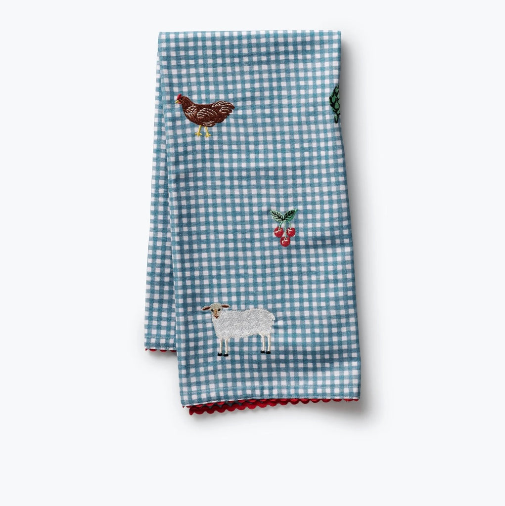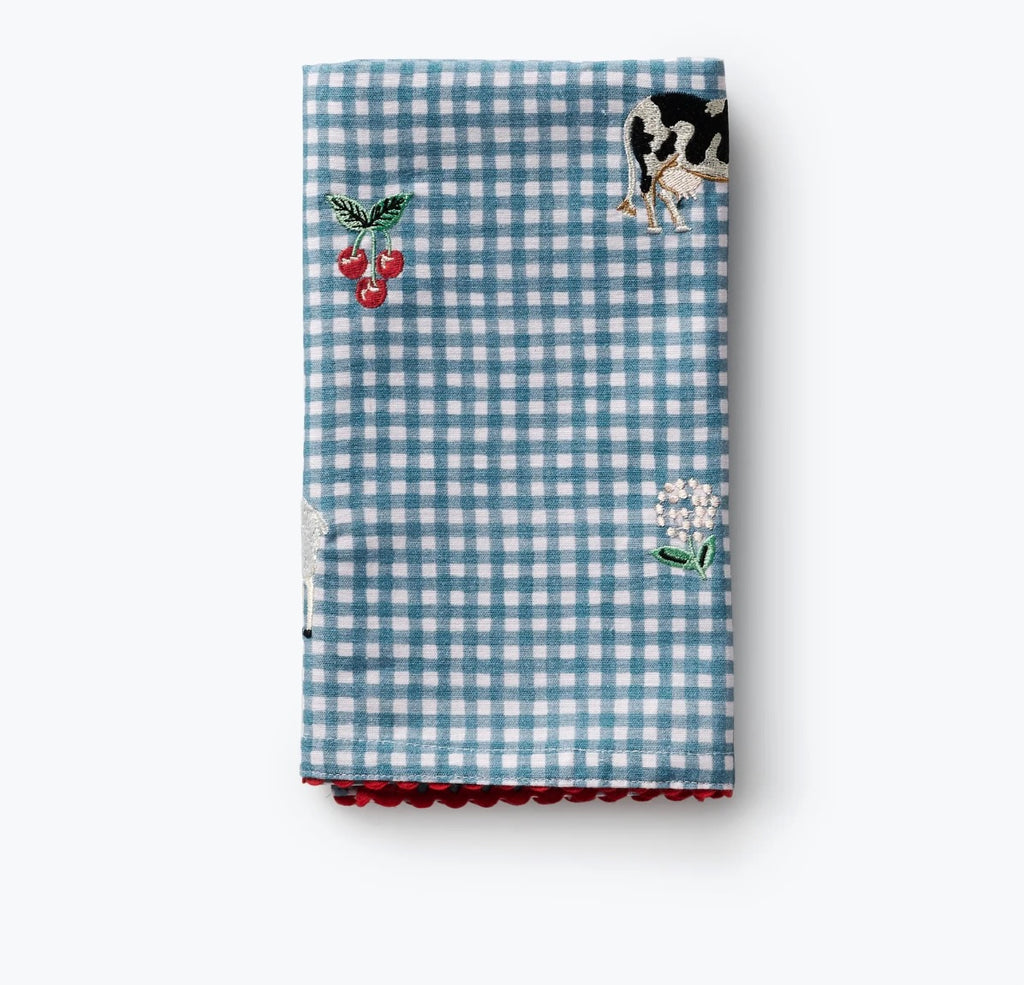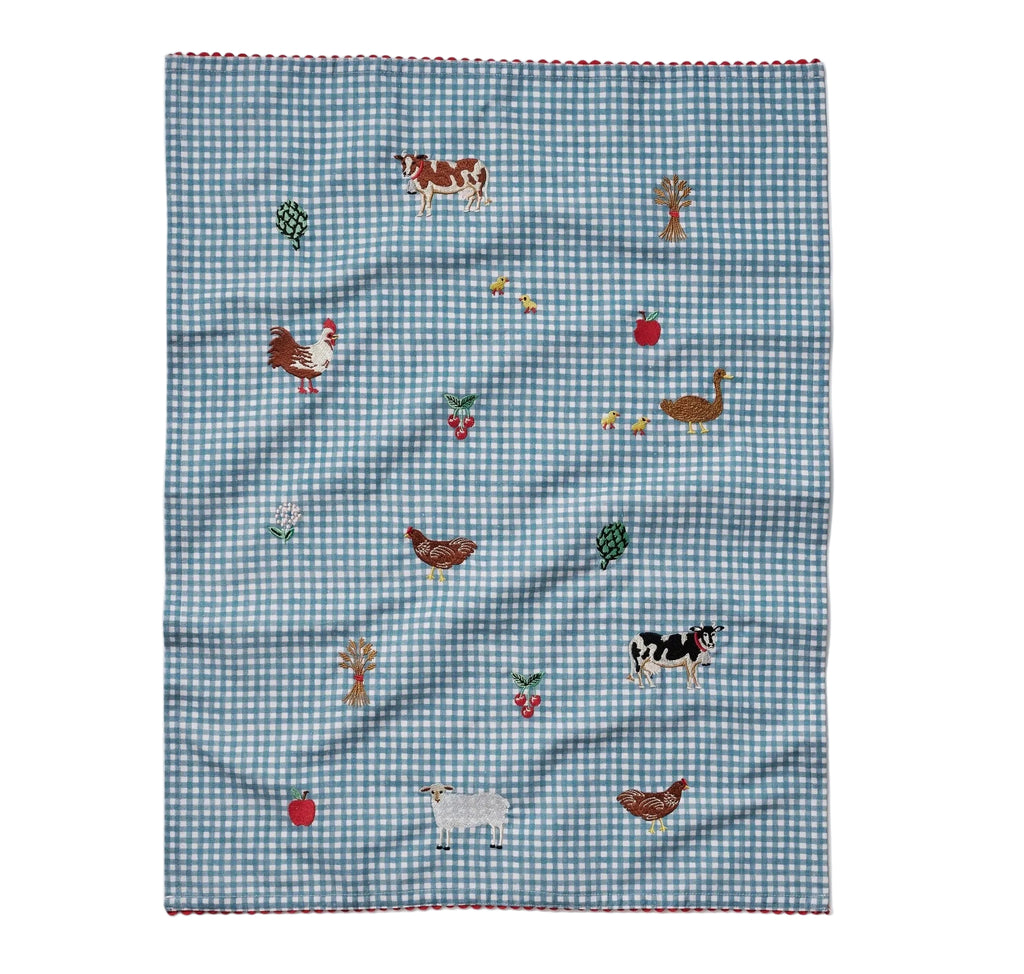 With charming illustrations and rick rack trim, this printed tea towel is perfect for lining a bread basket, drying dishes, or simply adding a bit of color to the kitchen!
