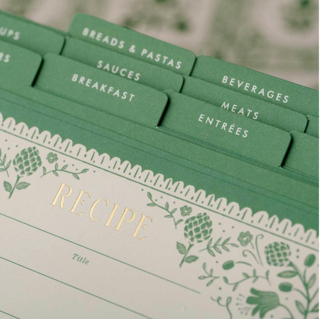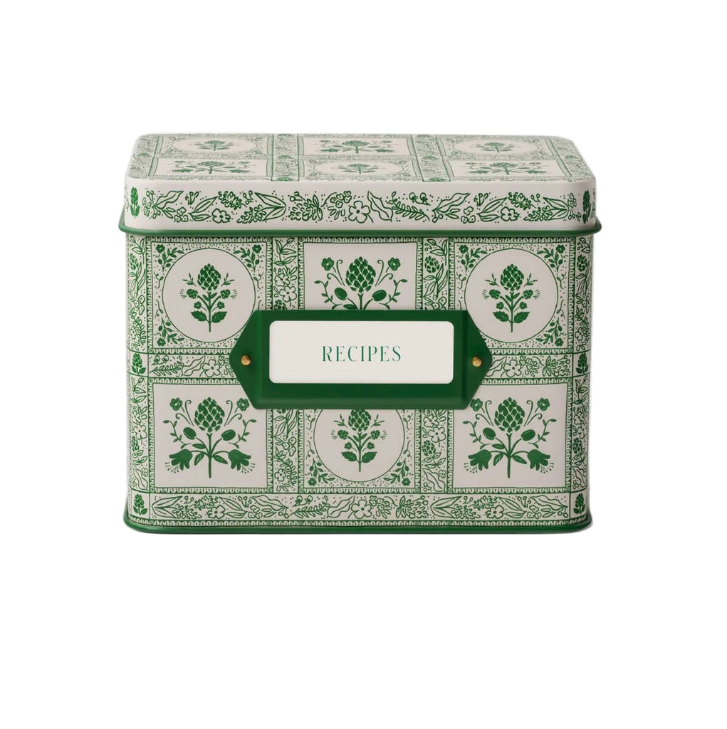 Never lose a family recipe with this charming Artichoke Recipe Tin! Holding up to 200 recipe cards, the countertop organizers feature printed illustrations, a gold metallic interior, and a gold-framed label, as well as 24 included recipe cards and 12 recipe dividers.