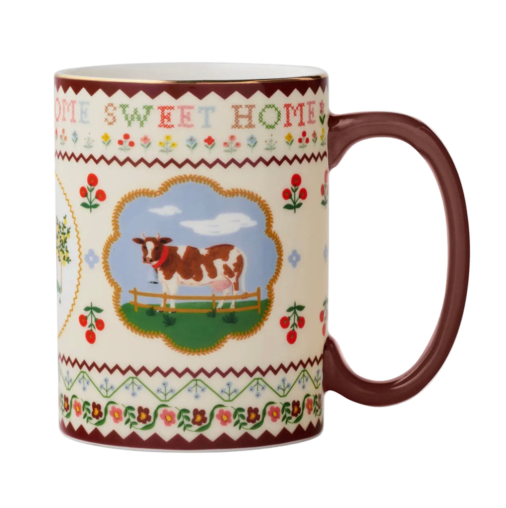 Folksy, farm-inspired illustrations, cross-stitch-style details, and a burgundy handle and rim make this charming mug an everyday favorite.