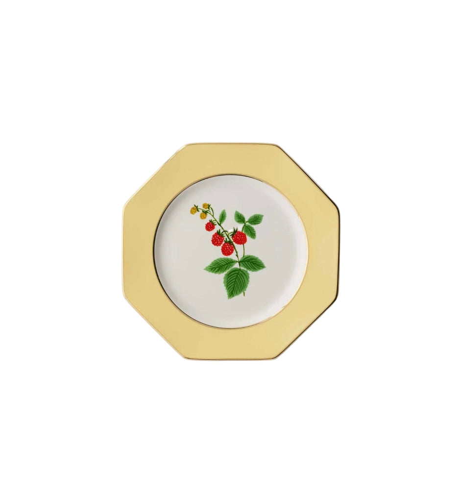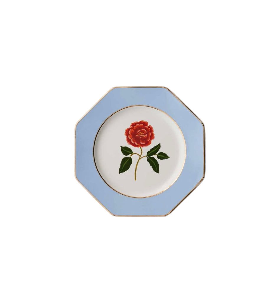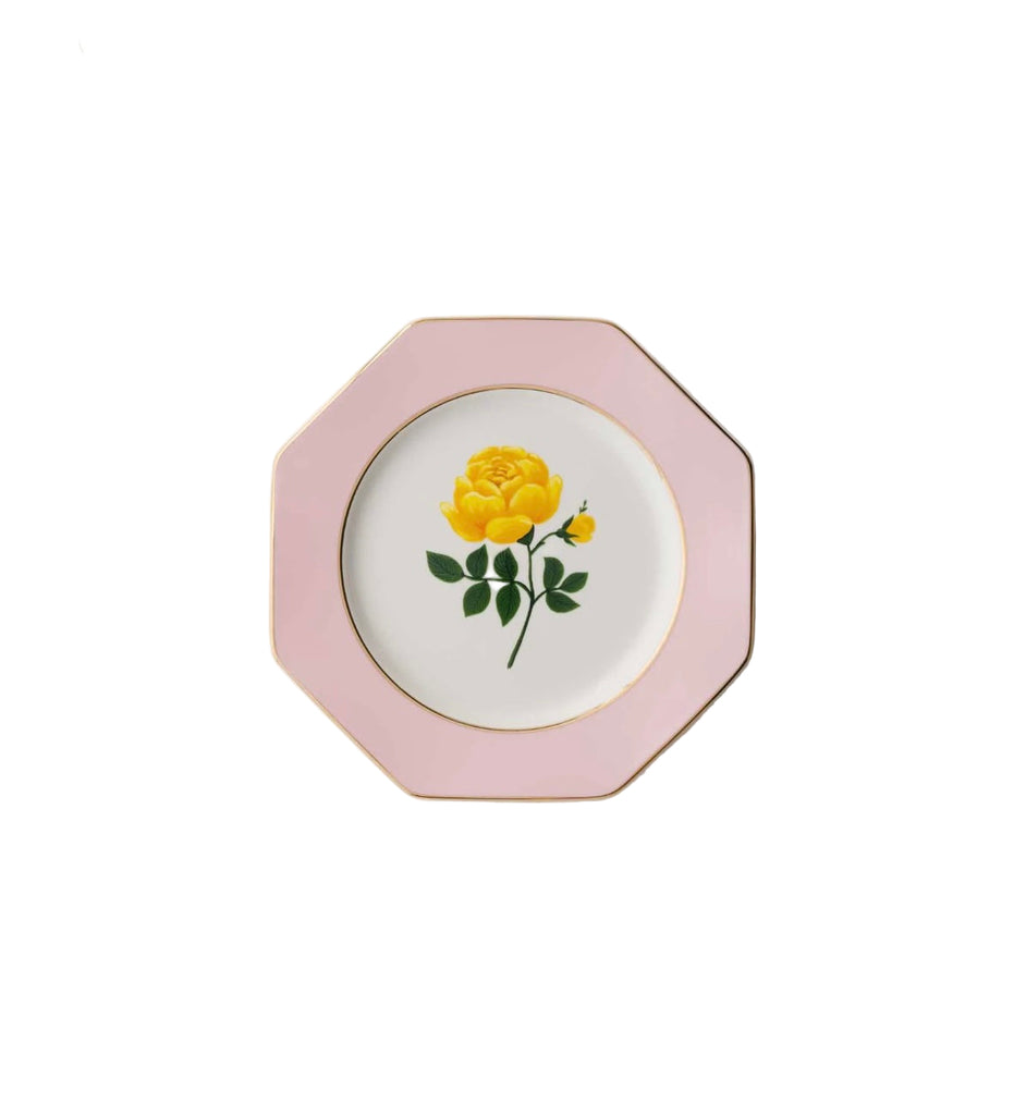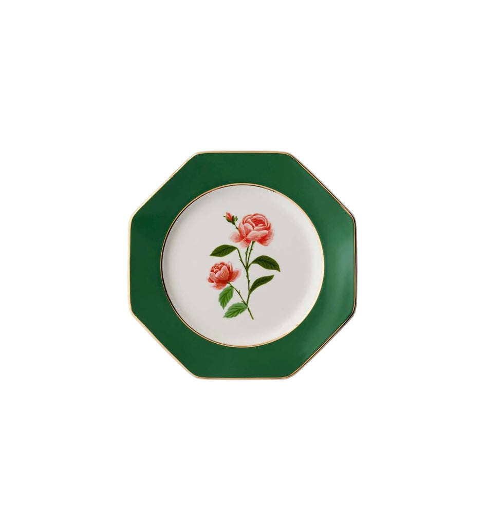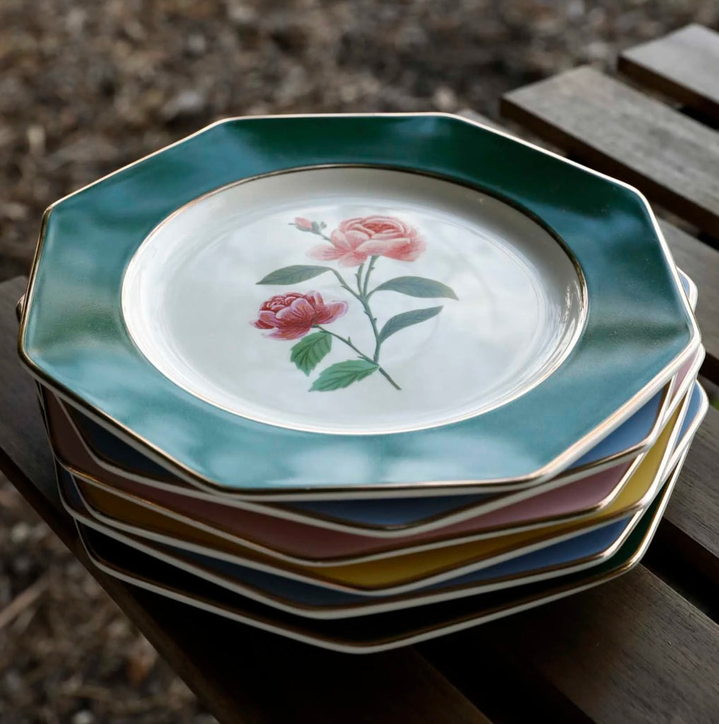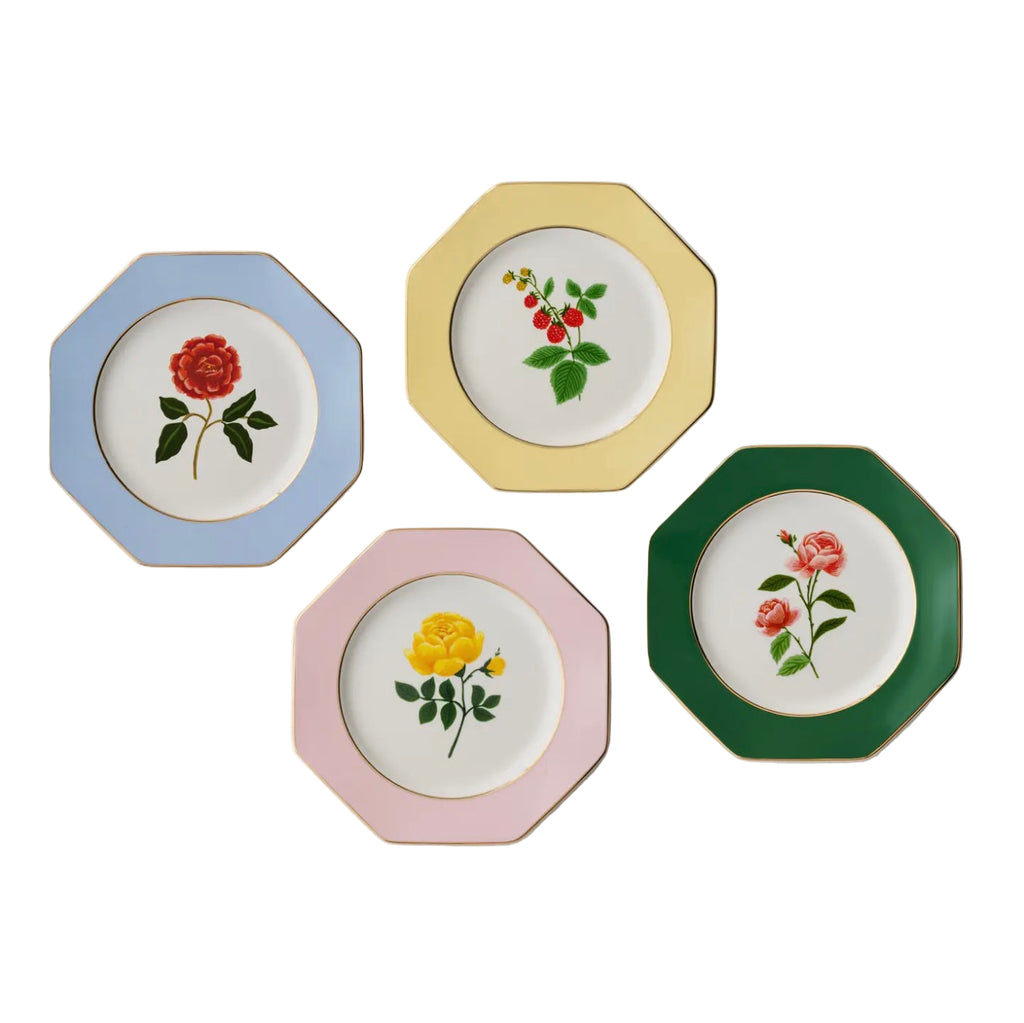 Elegant painted roses adorn these porcelain dessert plates, featuring four distinct designs, shimmering gold accents, and gold-painted edges.