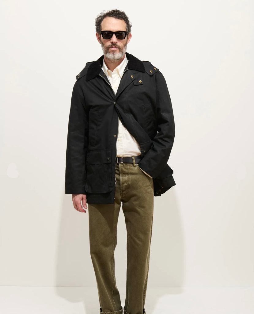 Details we love: Water-resistant waxed cotton, fully lined, hand warmer pockets, removable snap off hood, interior hidden zip pocket flannel plaid lining, Ring pull 2 way zipper, cuffs faced with corduroy, elbow pleat articulation, wind guard at neck.
