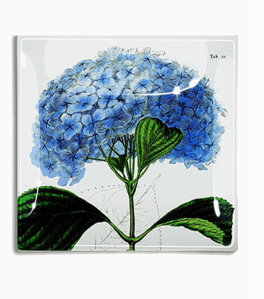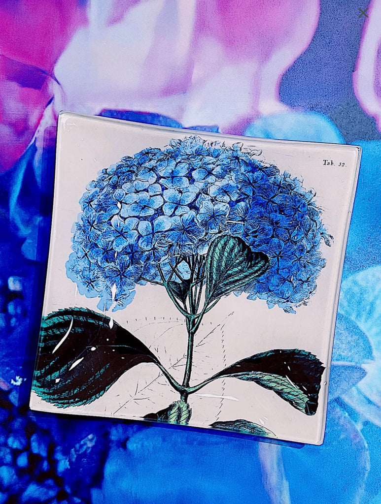 A delicate celebration of nature’s quiet beauty, this handcrafted glass tray features a vintage-inspired illustration of blue hydrangeas — timeless blooms long associated with grace, gratitude, and heartfelt emotion.