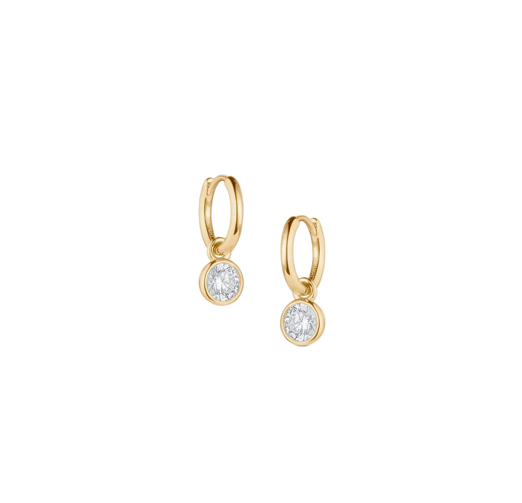 An everyday huggie hoop earring with removable dangly CZ charms, because some days just need a little extra shine!