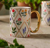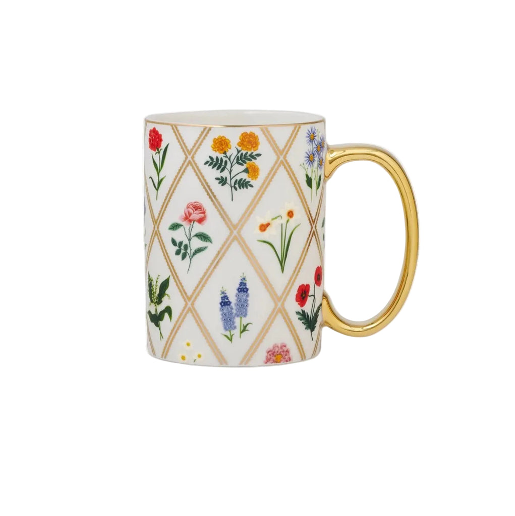 Detailed Garden Study florals bloom across this porcelain mug! Featuring a gilded rim and handle, this mug is the perfect gift!