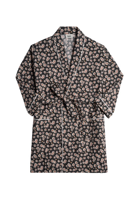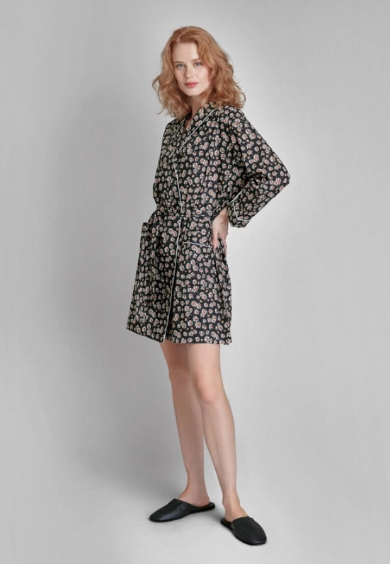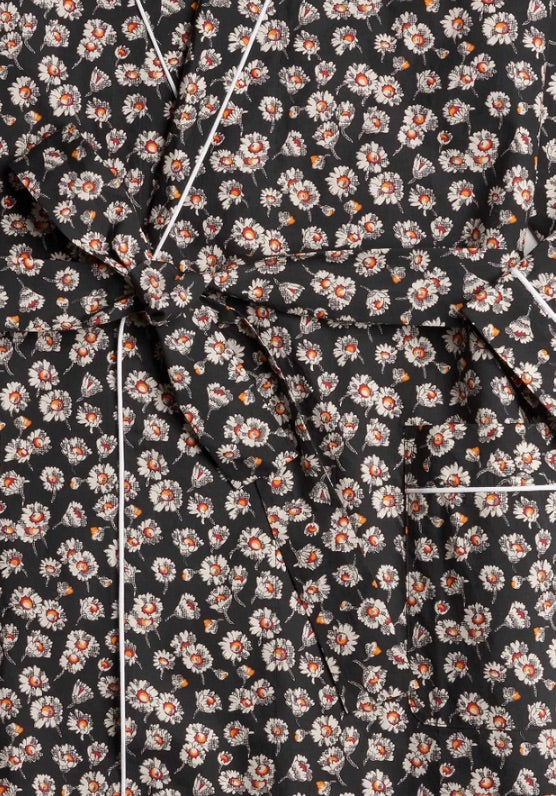 Isa is an all-purpose robe suited for indoor or outdoor use! Made of fine cotton fabric featuring a darling daisy print that was inspired by vintage French floral textiles. This mid-length cover up features slim piping details, two oversized pockets and a loose belt.