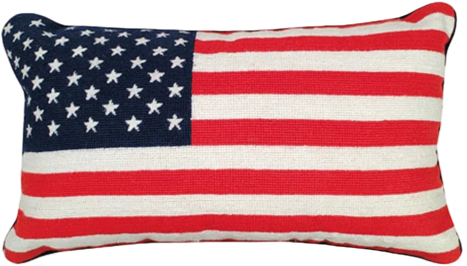 This stunning American Flag pillow deserves a place in your home year-round! Handmade and 100% wool! The red and white stripes and the blue corner are regular needlpoint while the white stars are petitpoint.