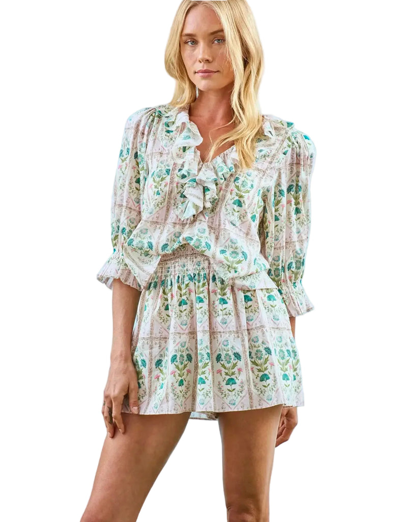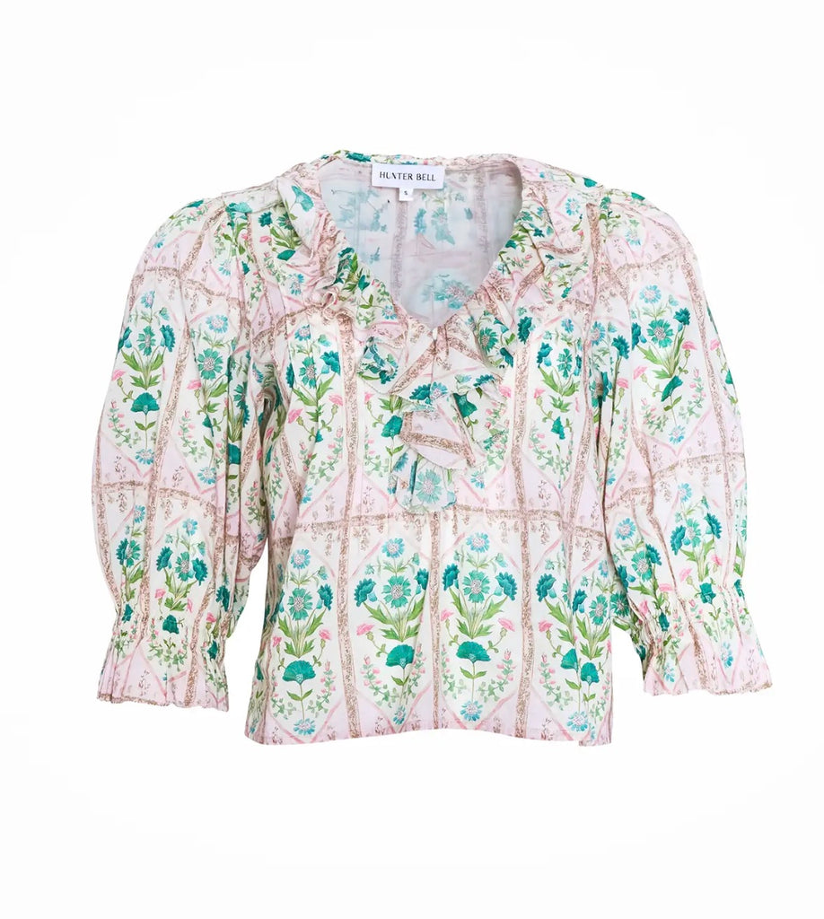 The Imogen Top is a feminine favorite, designed with thoughtful details that feel both delicate and refined. Crafted from lightweight cotton voile, it features soft pintucks, romantic ruffle accents along the V-neckline, and airy elbow-length sleeves!