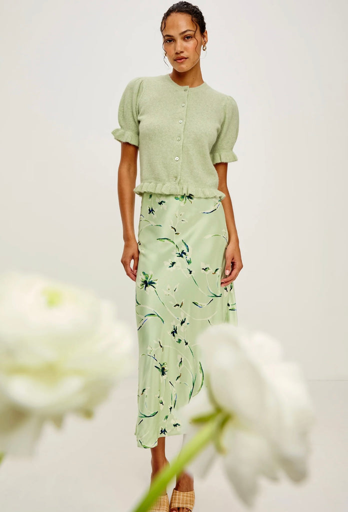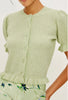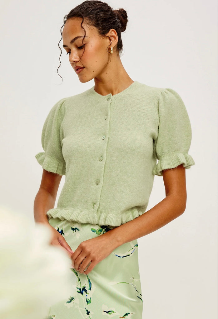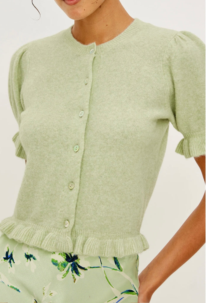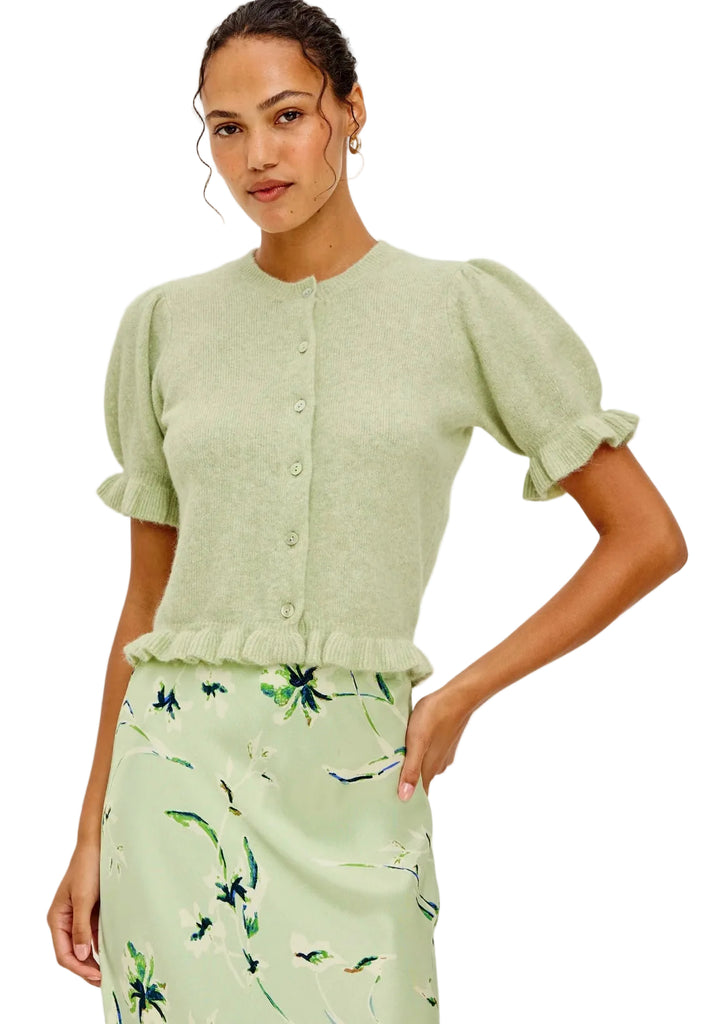 Crafted from a cozy wool blend, the Lora crewneck cardigan charms with front buttons and ruffle-trimmed short puff sleeves and hem.