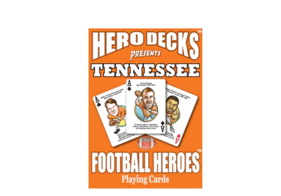 The Tennessee Football Hero Deck playing cards for Tennessee Volunteers fans feature fifty-two of the greatest players by position and era in Tennessee Volunteers Football history! The face of each playing card is colorfully illustrated with a different hero ... this deck is sure to be a touchdown with Volunteers fans of all ages!