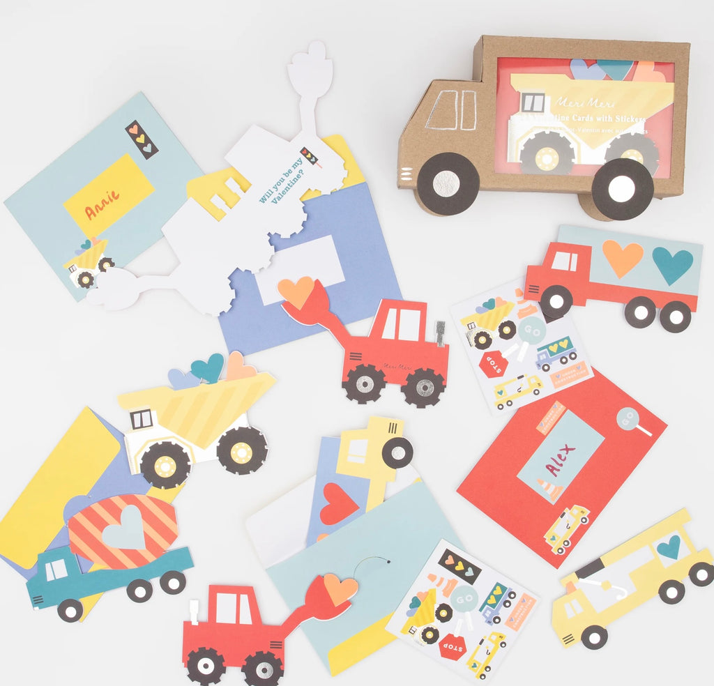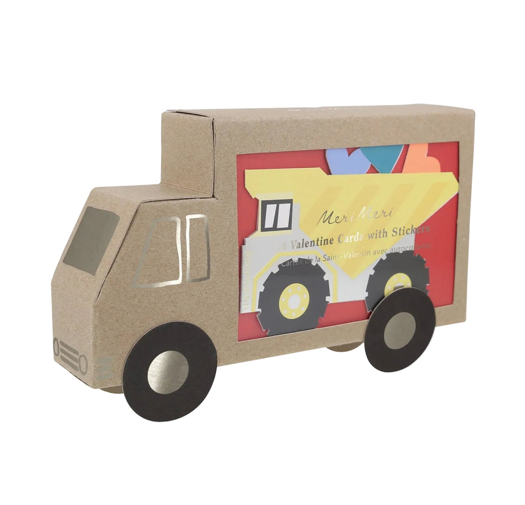 Beep, beep! Kids who adore trucks and love Valentine's will get all revved up when they see this special transport set! It includes brightly colored truck Valentine's cards, with fun stickers to add in as a gift, and envelopes. And our clever designers have put them all into a fabulous big truck box with shiny wheels.