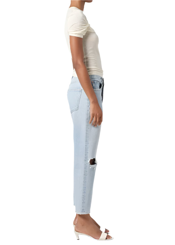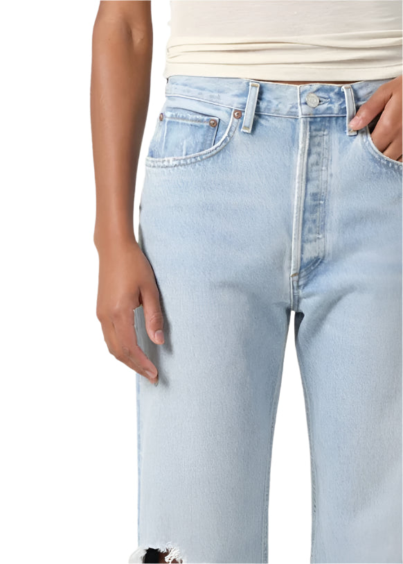 The best-selling 90's Jean but with a cropped inseam. This mid-rise jean is designed to sit relaxed at the waist with an easy fit through the hips into a classic, loose straight leg. Style back to anything and everything. Crafted in Agolde's signature Regenerative Cotton, this pair will only get softer with each wear.