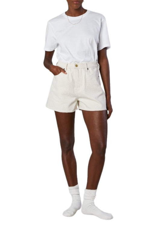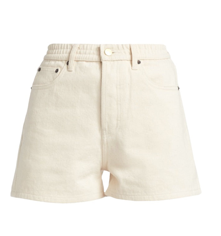 Still Here Ames jean shorts in the most perfect milky white denim. Inspired by vintage kid's shorts, with an a-line silhouette, scrunched waistband, button fly, and signature 'SH" embroidery. Worn by Taylor Swift herself!!