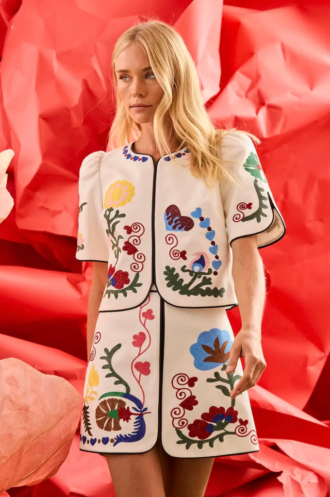 The Beeson Top is back in a new Stitchtopia print for spring! A vintage-inspired gem with signature HB charm, the Beeson Top is one of Hunter’s personal favorites this season. Designed with a classic crew neckline and short sleeves, it features a relaxed, non-fitted bodice that’s effortlessly easy to wear. Finished with a hidden back zipper for a clean silhouette, it pairs beautifully with the matching Dottie Mini Skirt!