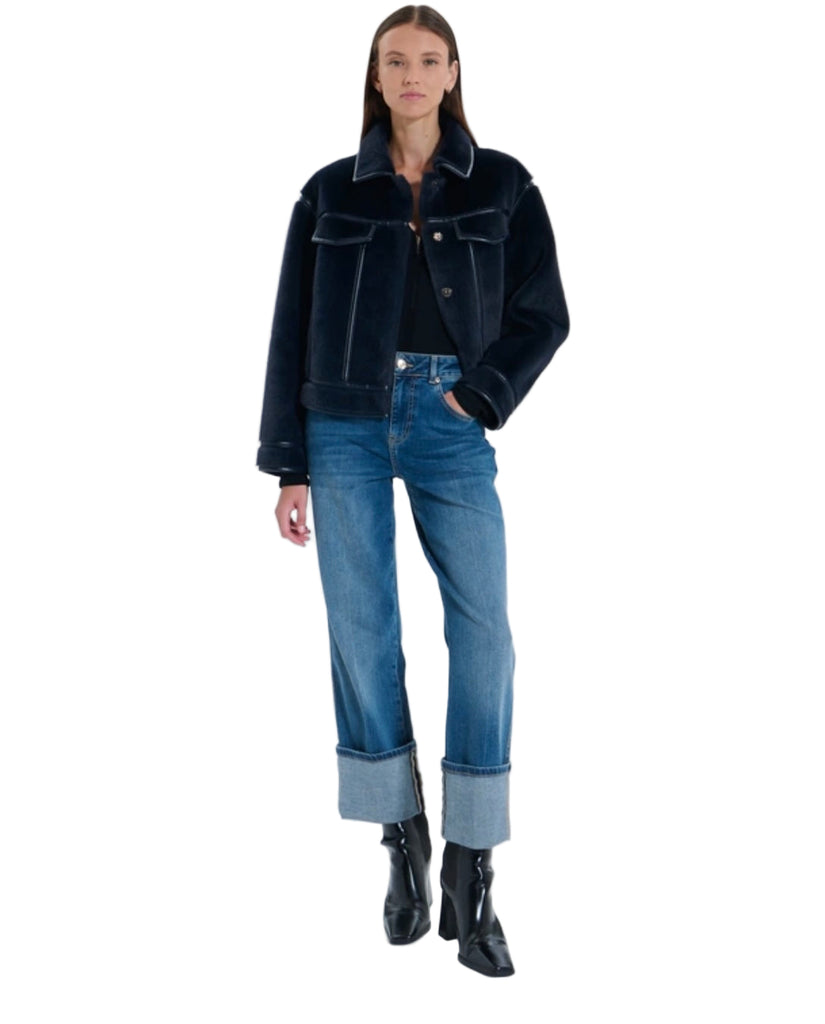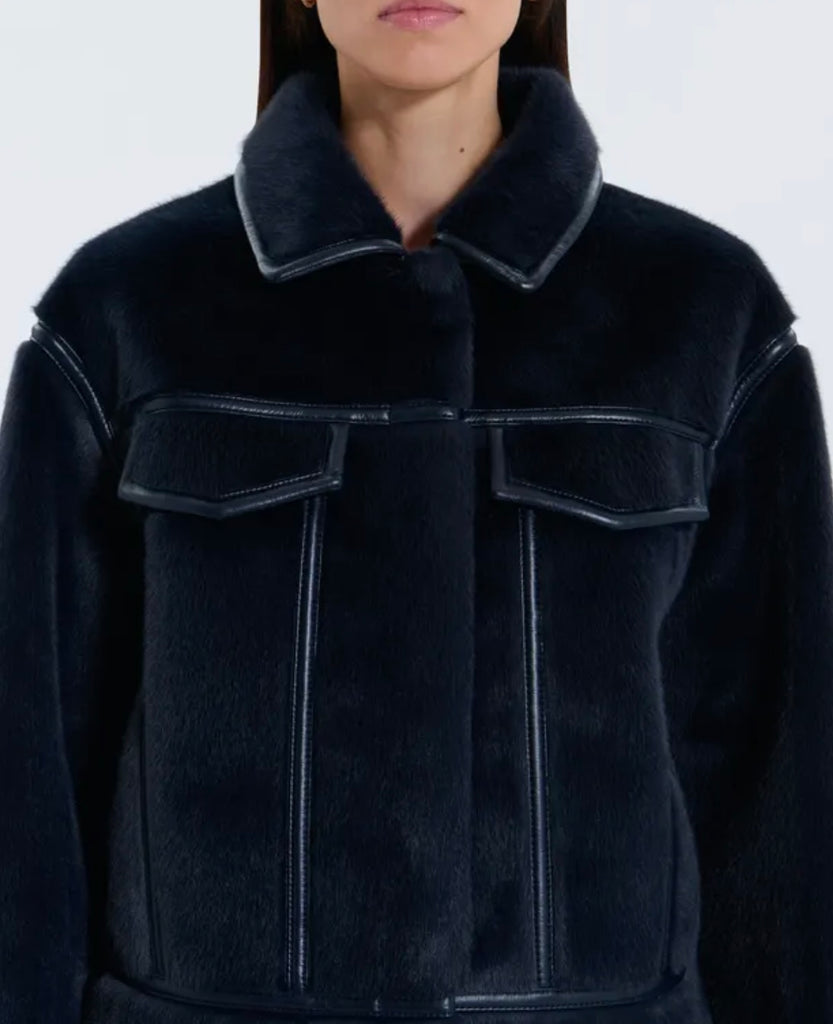Discover this elegant and versatile short navy jacket, decorated with faux fur. Completely reversible, its like two coats in one! This piece a perfect choice for facing cool days with style and comfort.