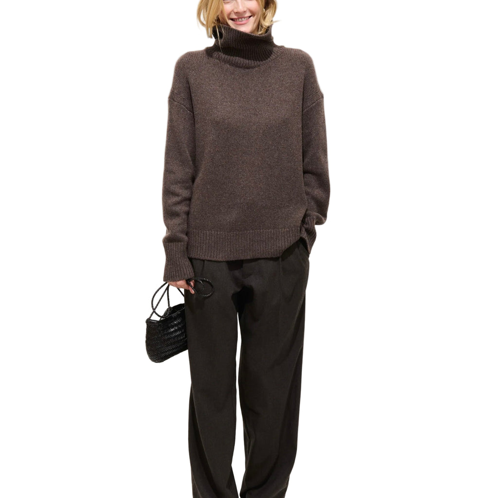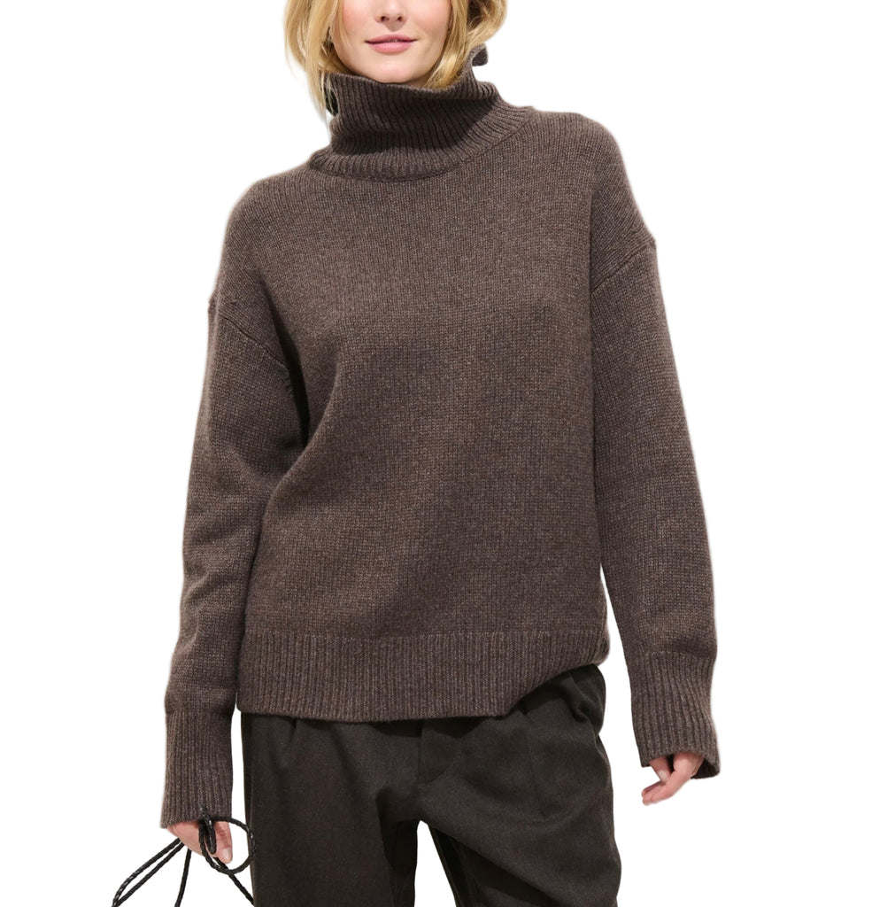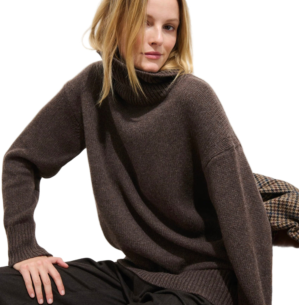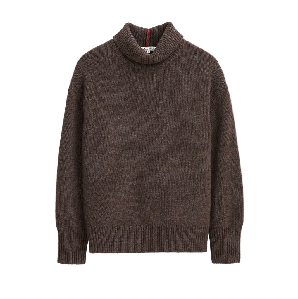 This delicious turtleneck will become a closet favorite in the colder months! Knitted from a supersoft wool cotton blend, oversized fit, contrast chain stitching at interior.