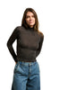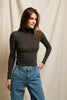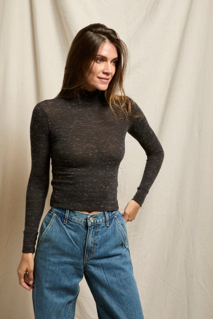 The Rosario is designed with a sleek mock neck and a slim, body-skimming fit. Crafted from lightweight fabric, it has a slightly sheer finish that adds a touch of modern elegance while keeping it versatile for layering or wearing on its own. The heathered texture gives depth and softness to this timeless silhouette. It feels both elevated and effortless, and the mock neck offers a polished touch without the bulk of a full turtleneck.