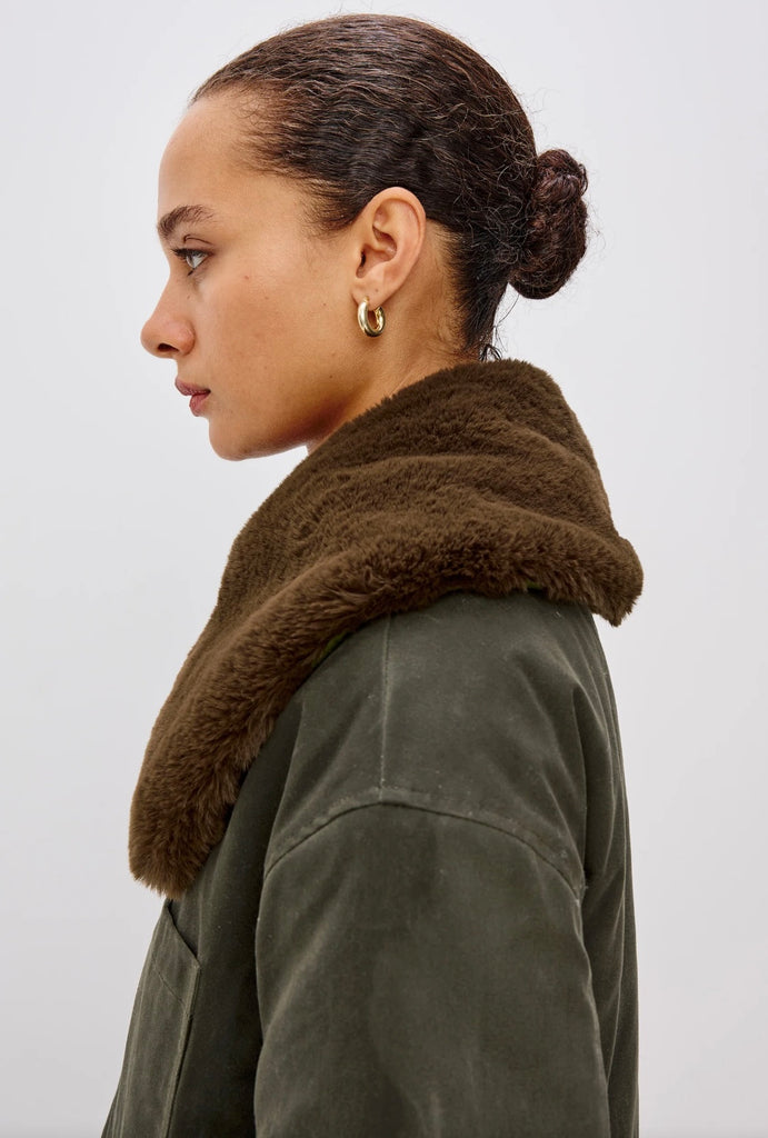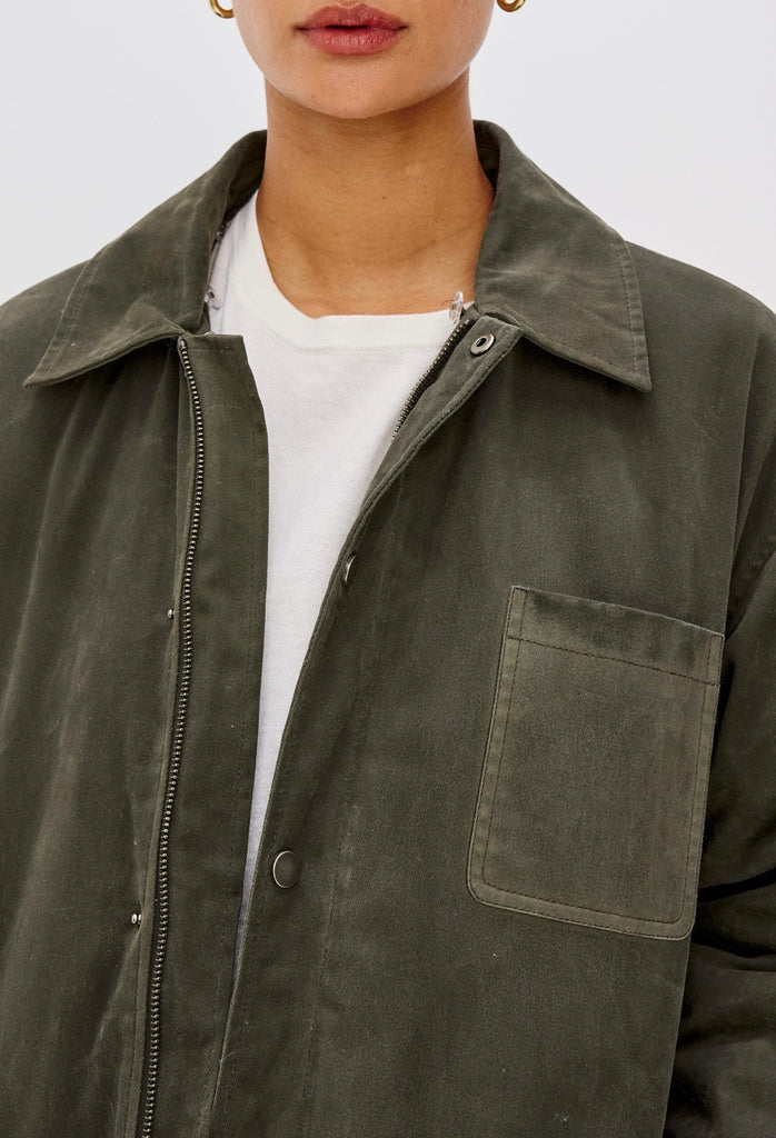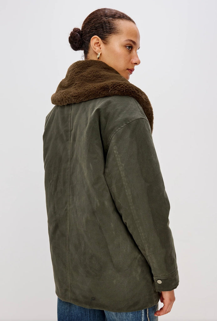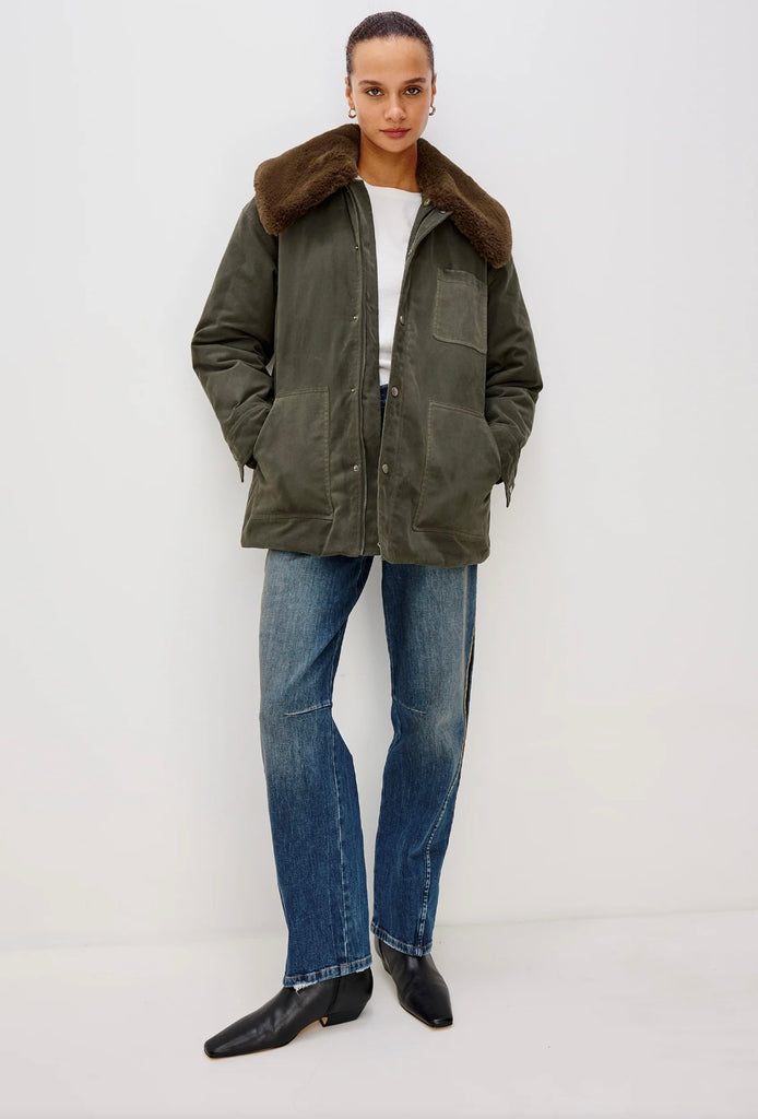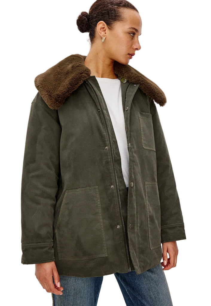 Workwear-inspired and exceptionally warm, the Tessuto is designed in waxed cotton canvas with subtle texture. This outerwear essential features a removable vegan-fur collar, front zipper with snap closures, lightly quilted interior, chest patch pocket, and side pockets for functional style.