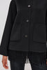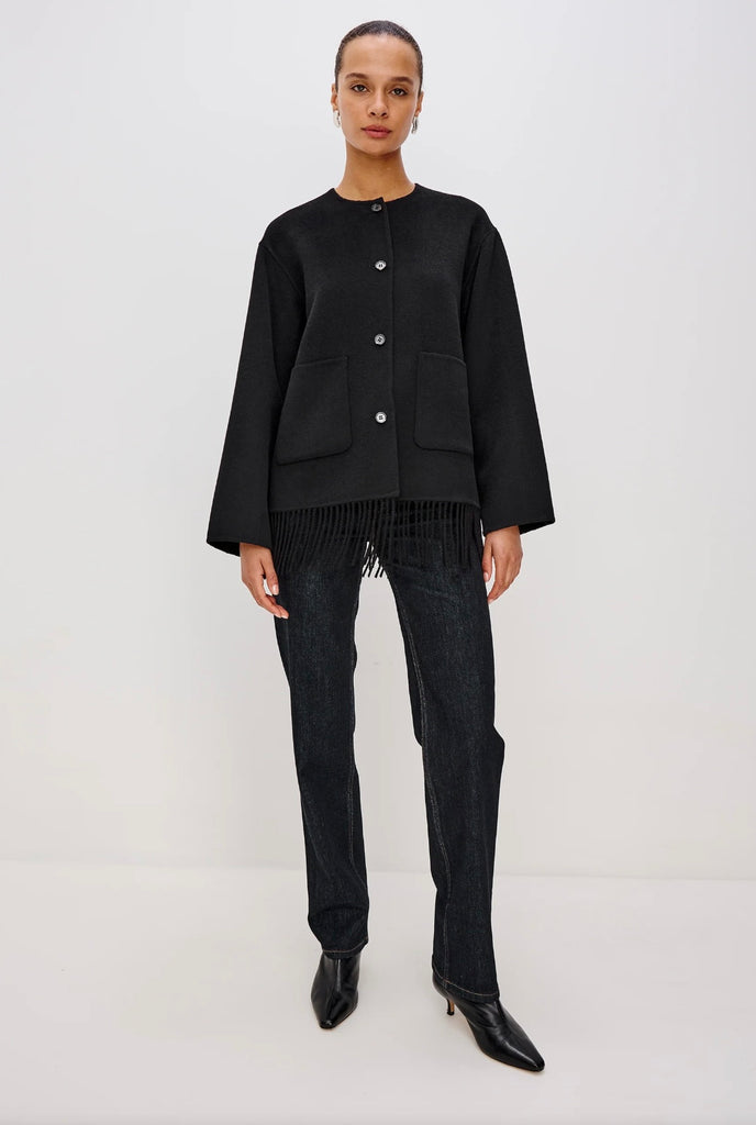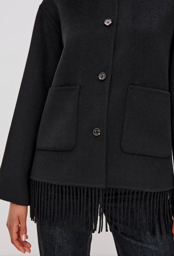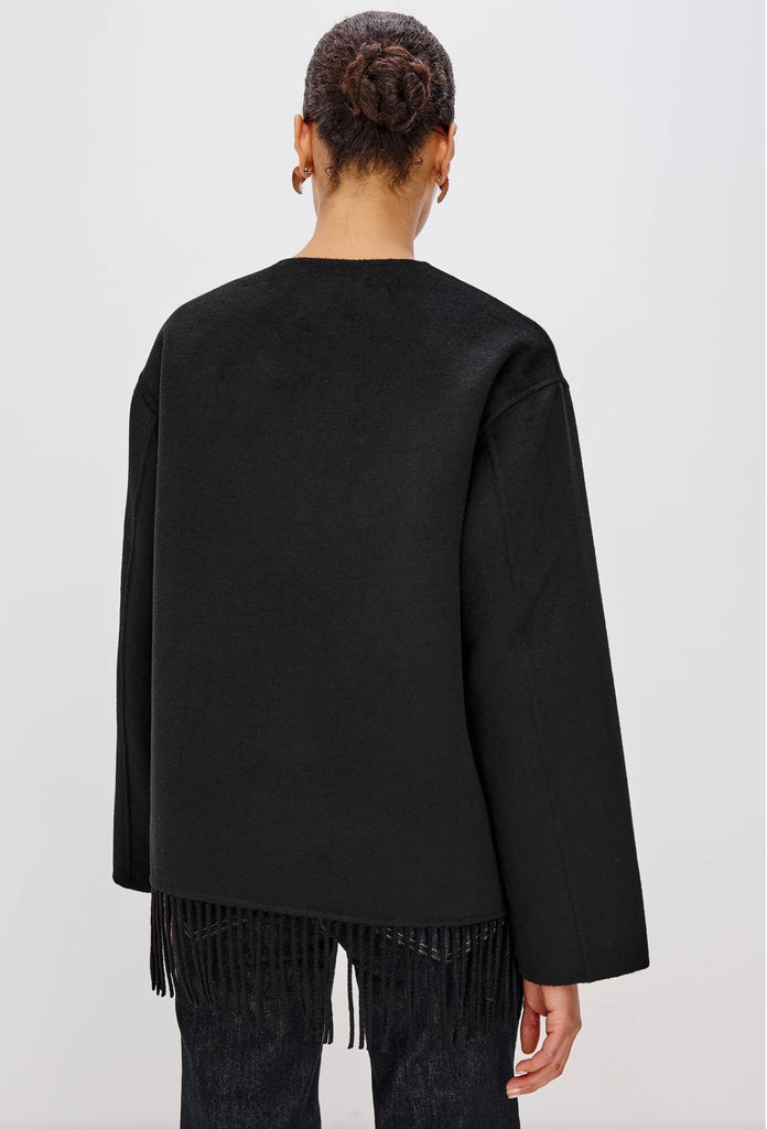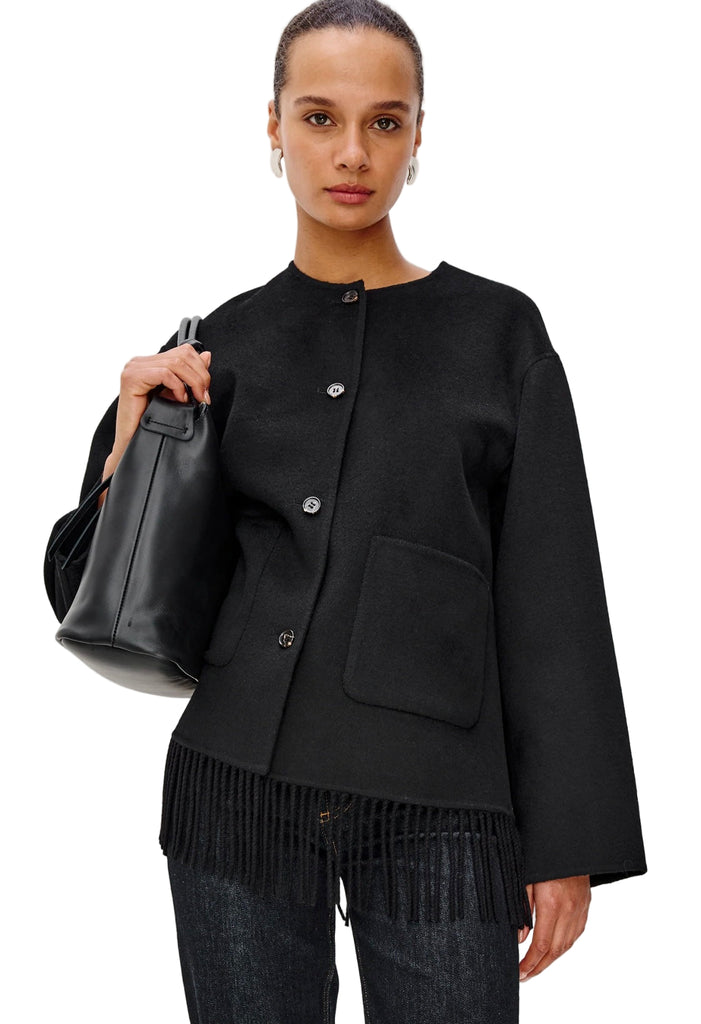 The Tomoko combines structured sophistication with cozy comfort. Made from a super-soft heavyweight wool blend, it features front button closures, patch pockets, and fringe detailing at the hem for playful drama!