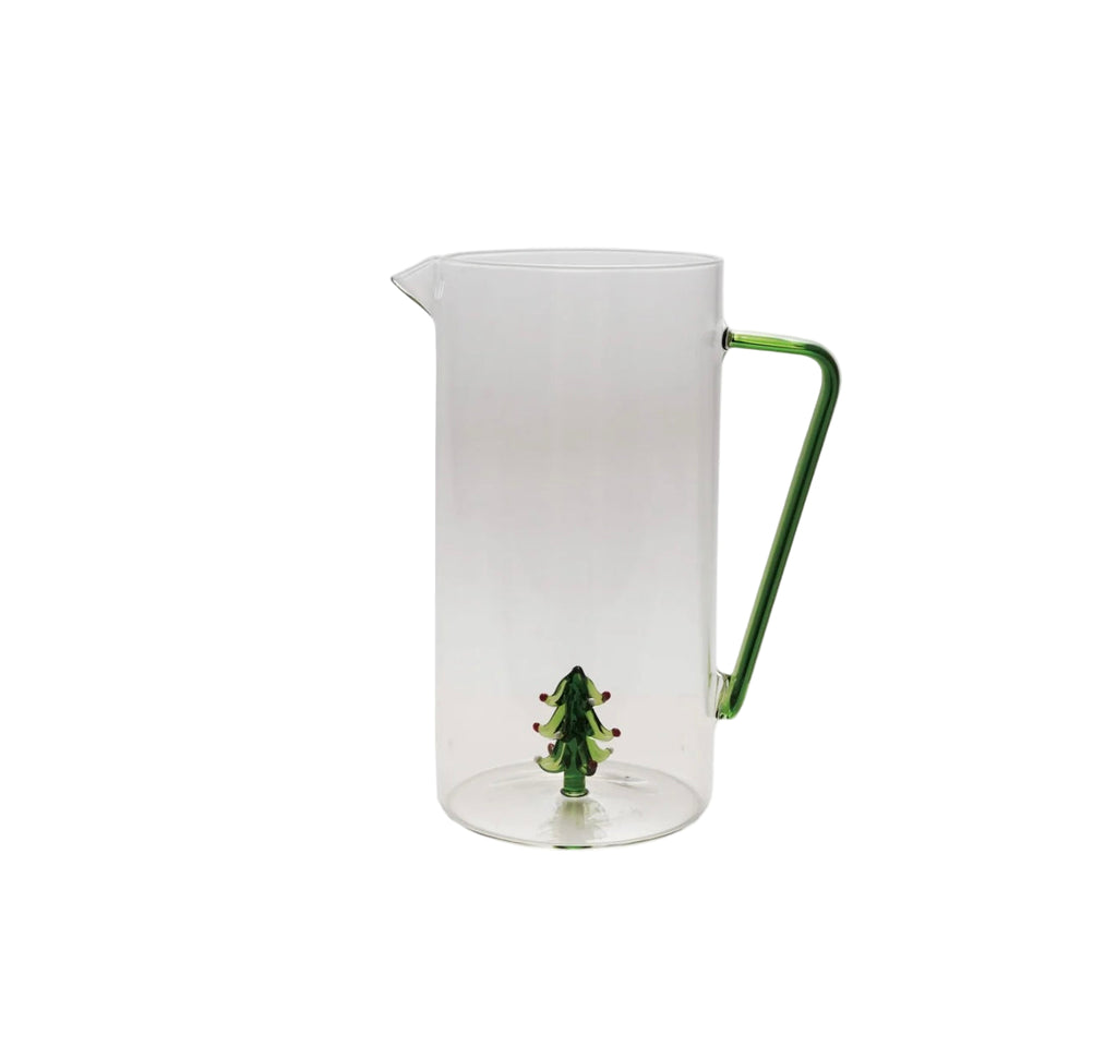 3 Quart Glass Pitcher W/ Green Handle & Hand-Blown Tree Inside