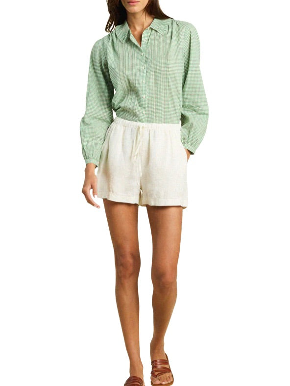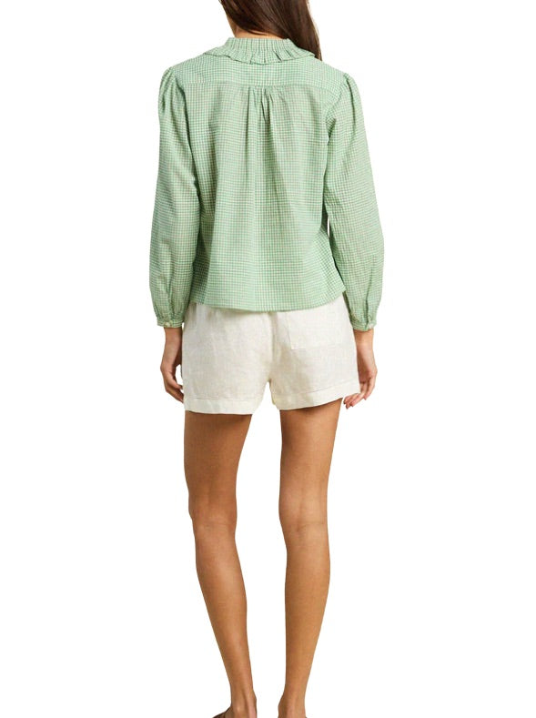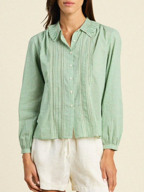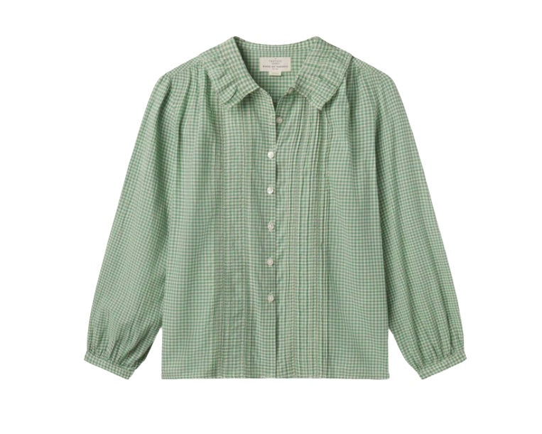 The Alise Blouse features variegated pintucking that delicately borders a front buttoned placket. Additional pintucks encircling the neck release into a gently ruffled bib collar, perfect for layering with a light sweater. Whether paired with tailored trousers for a professional setting or dressed down with jeans for a casual look, this blouse exudes personality and timeless elegance.