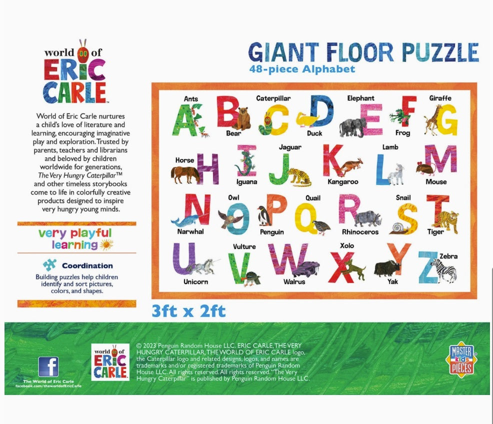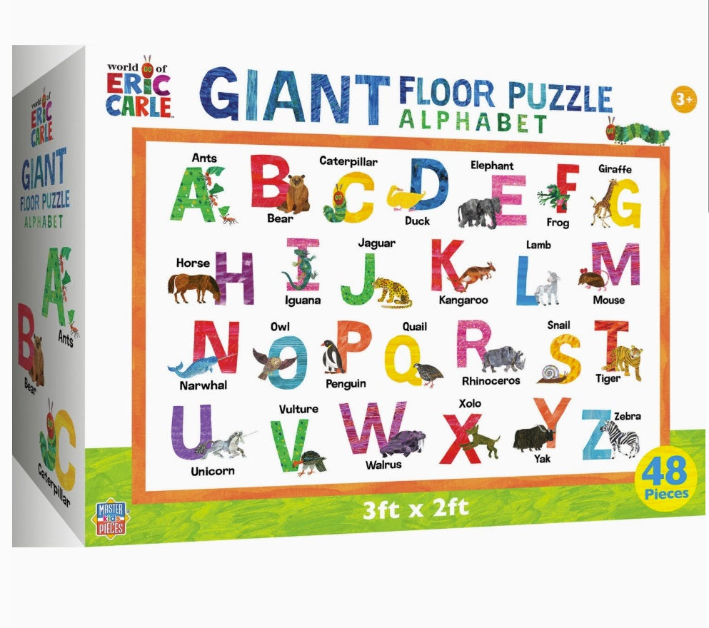 Designed for children aged 3 and up, this jumbo puzzle measures an impressive 36" x 24" when fully assembled. Featuring the beloved artwork of Eric Carle, it combines the joy of learning the alphabet with the whimsy of animal illustrations. Made from 100% recycled paper board, this puzzle is not only colorful and nostalgic but also eco-friendly.