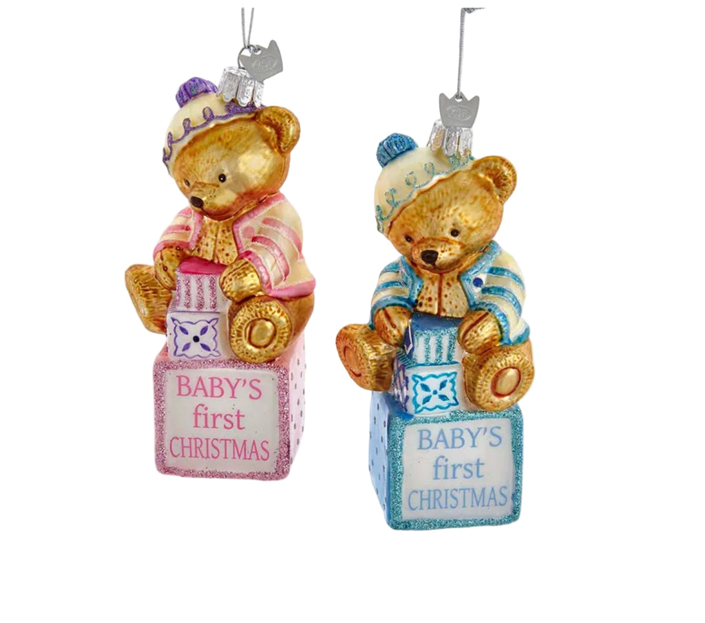 Baby's First Christmas" baby bear ornaments are a wonderful addition to your holiday decor or Christmas tree. This assortment features pink baby bear and a blue baby bear each sitting atop a glittered children's block.