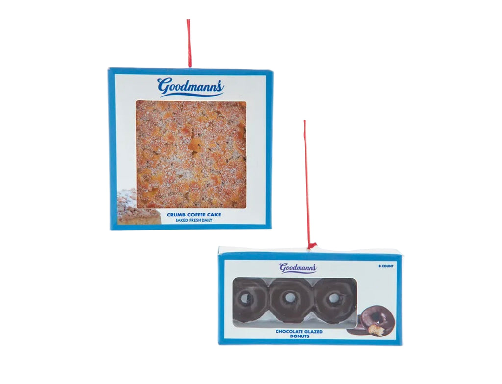 Satisfy your sweet tooth with these delightful Boxed Crumb Coffee Cake & Donuts Ornaments! Two assorted styles, crumb coffee cake or the chocolate glazed donuts! Take your pick!