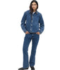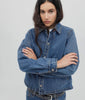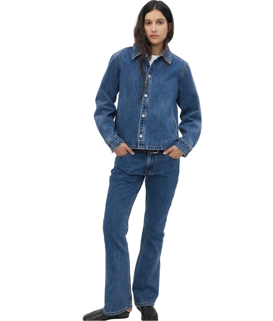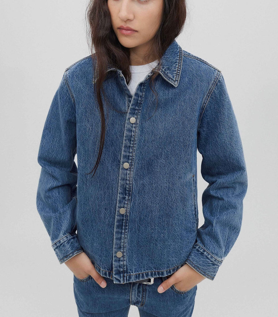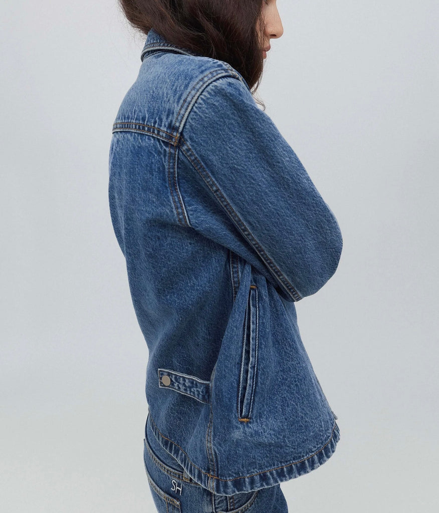 The Coach Jacket is a classic denim jacket with a snap closure and a boxy fit. It features side pockets and adjustable cinch straps.