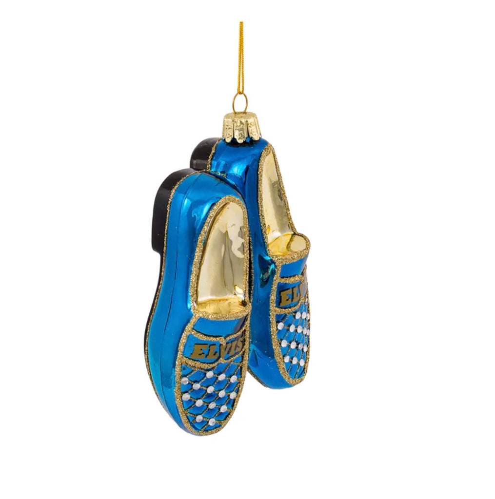 This Elvis® blue suede shoes glass ornament is the perfect way for any Elvis® fan to have a "blue" Christmas! The glittering ornament resembles a pair of blue suede shoes with Elvis'® name printed on each shoe and is carefully detailed in a quilted rhinestone design.