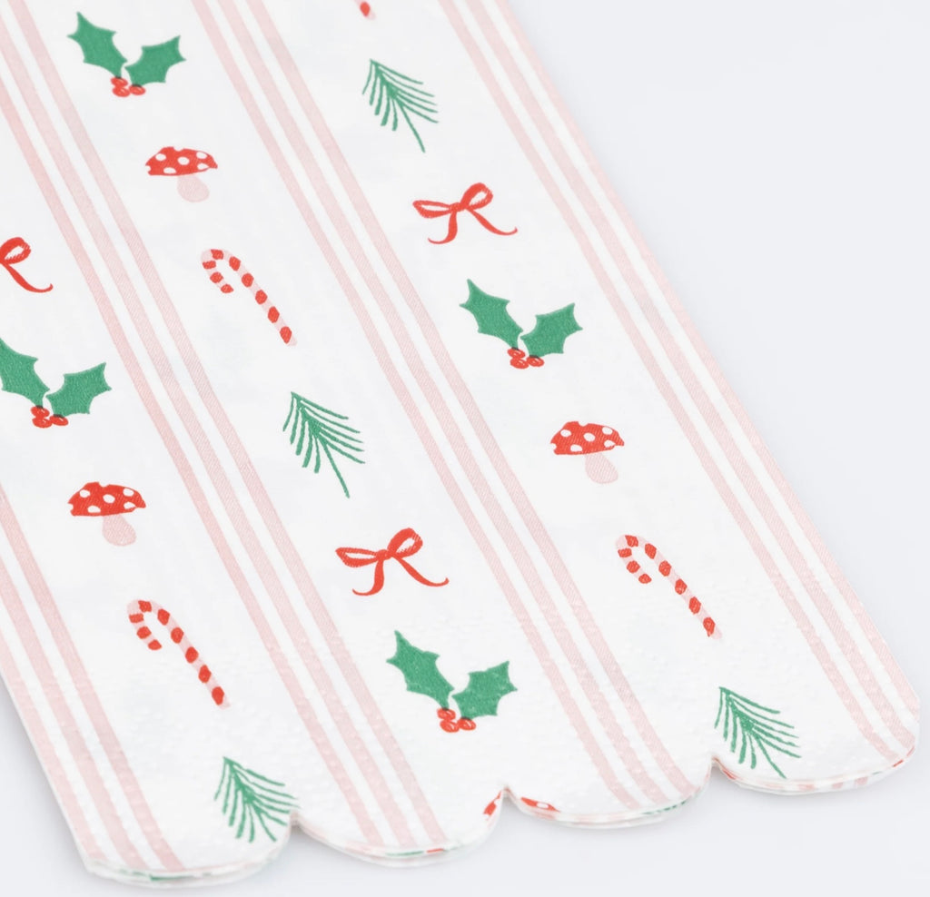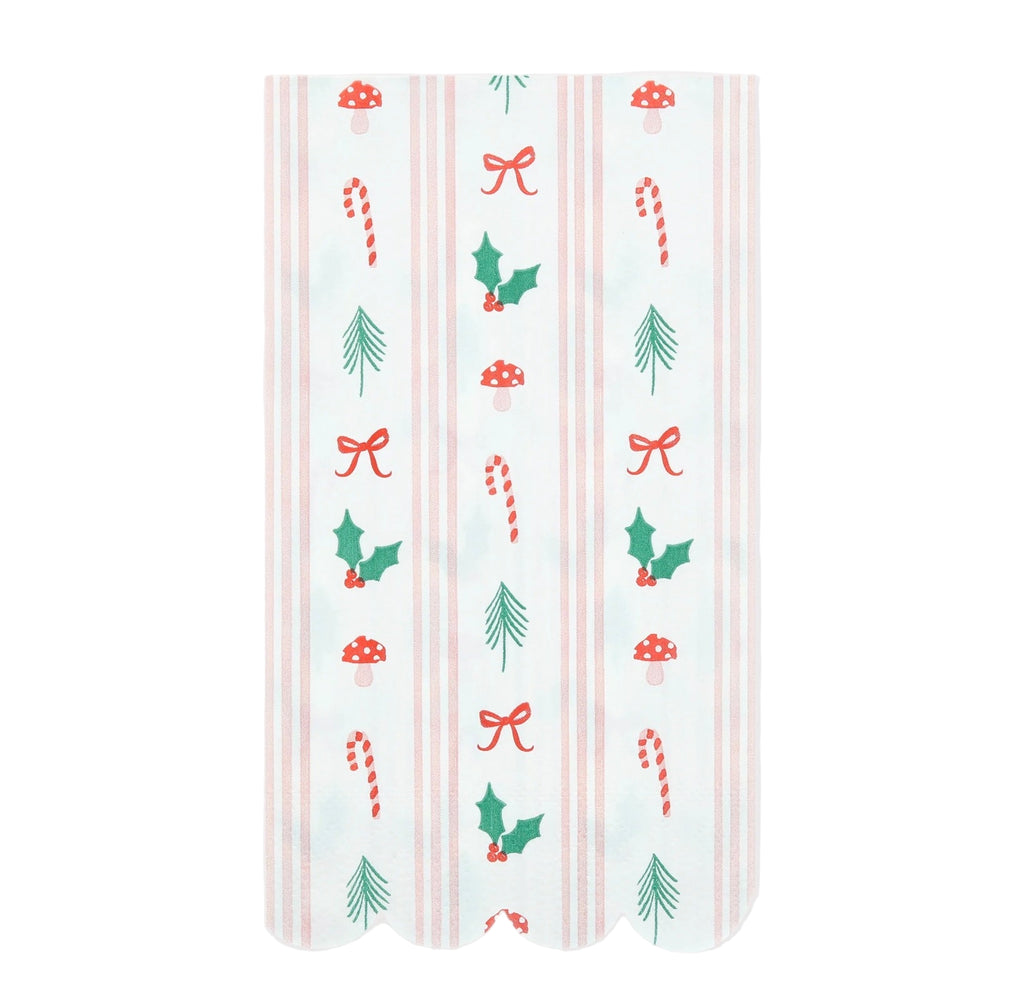 Why settle for just one Christmas motif when you can have a mix of statement icons? Inspired by nostalgic wallpaper patterns, this design blends classic red and green with trend-forward pink stripes for a fresh feel. A chic and practical way to add a touch of tradition for the holidays. Ideal to place in your guest bathroom or to use on your party table.