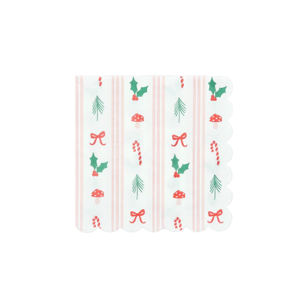 Why settle for just one Christmas motif when you can have a mix of statement icons on your table? Inspired by nostalgic wallpaper patterns, this design blends classic red and green with trend-forward pink stripes for a fresh feel. The scalloped border also adds the perfect touch of style. These small paper napkins are ideal to mix and match with your other party essentials.