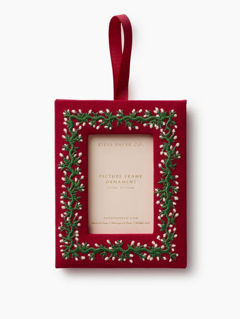 Display your favorite holiday memory in style with the Garland Embroidered Frame Ornament. Wrapped in delicately stitched greenery and metallic thread accents, this petite fabric frame adds a charming handmade touch to your tree. Slip in a photo, monogram, or tiny keepsake to create a personalized heirloom you’ll hang year after year. Finished with a coordinating ribbon for easy hanging, it’s a heartwarming blend of nostalgia and craft.